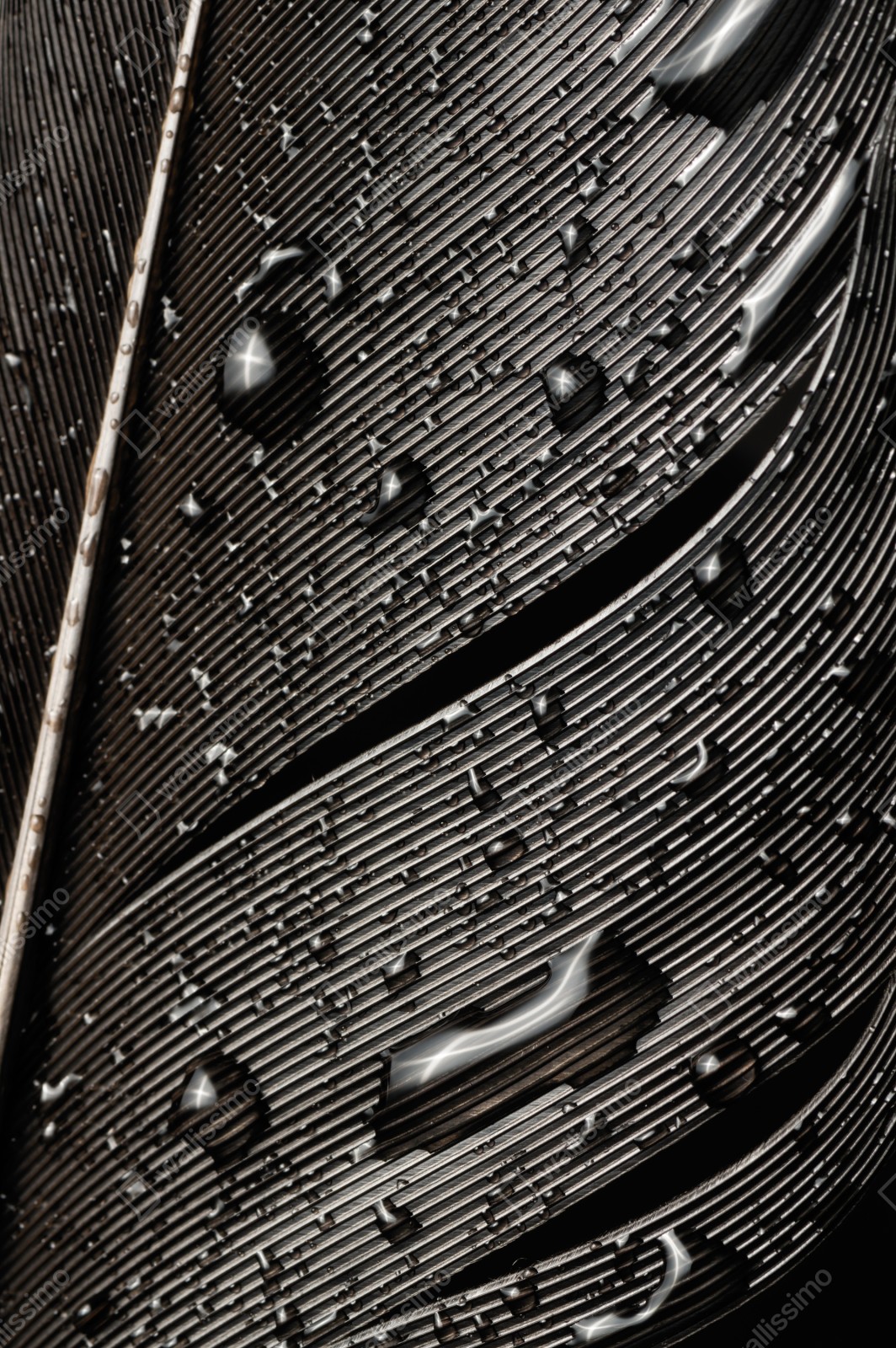Elegante monochrome Nahaufnahme einer Vogelfeder mit Wassertropfen, die feine Textur und Kontraste für moderne Innenräume betont.