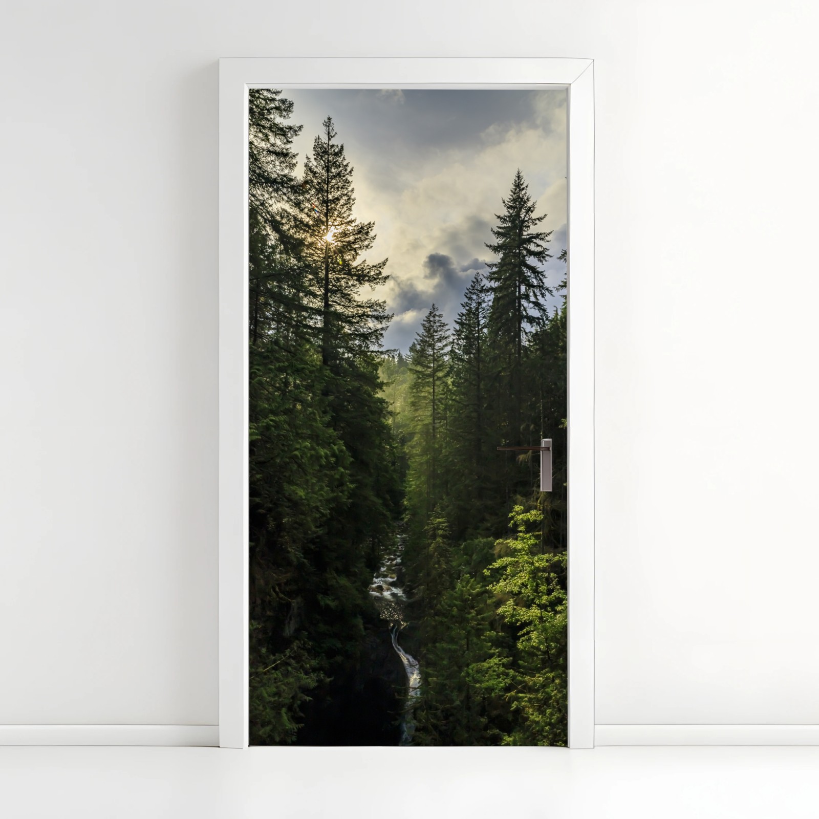 Türaufkleber Nebliger immergrüner wald mit wasserfall