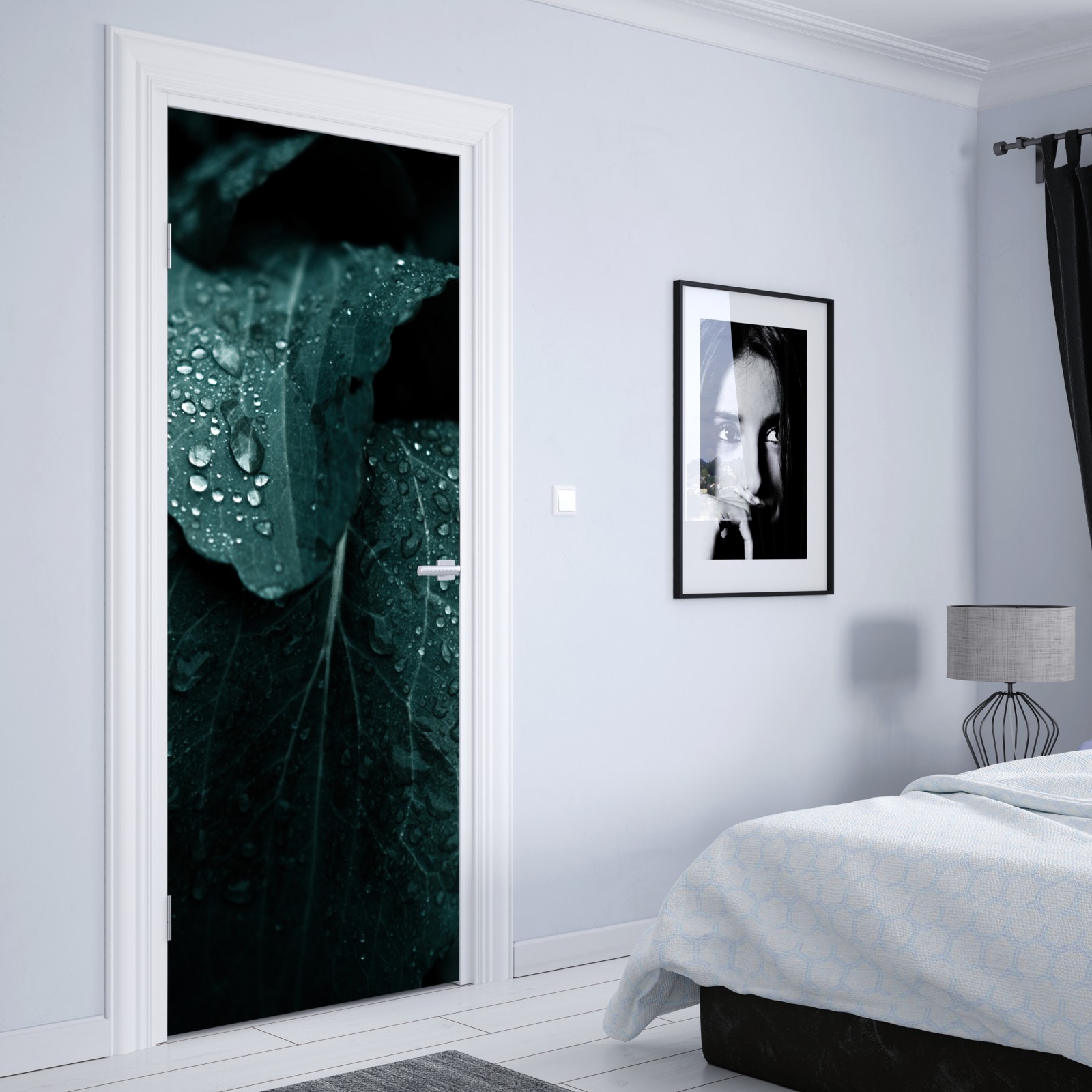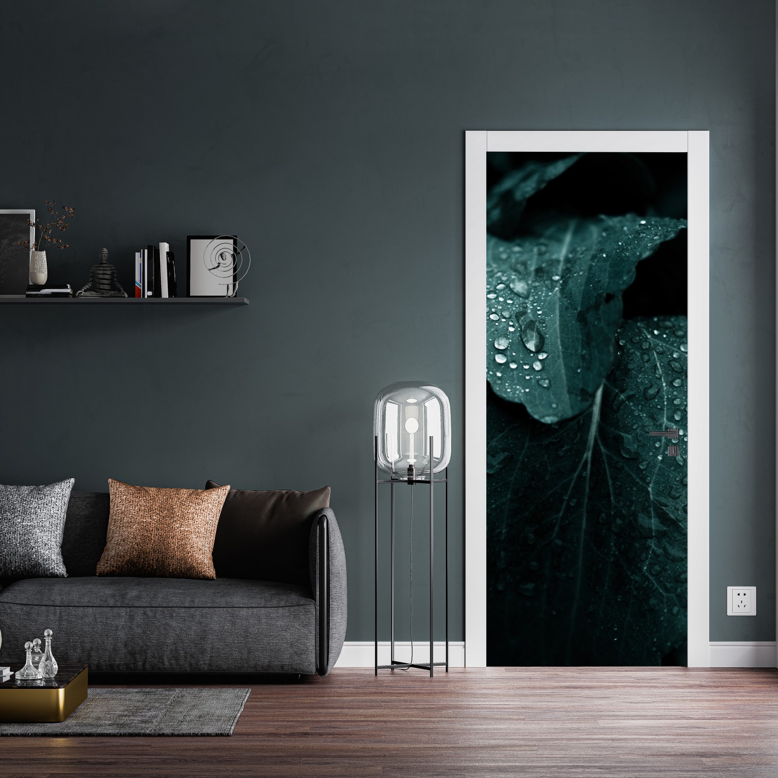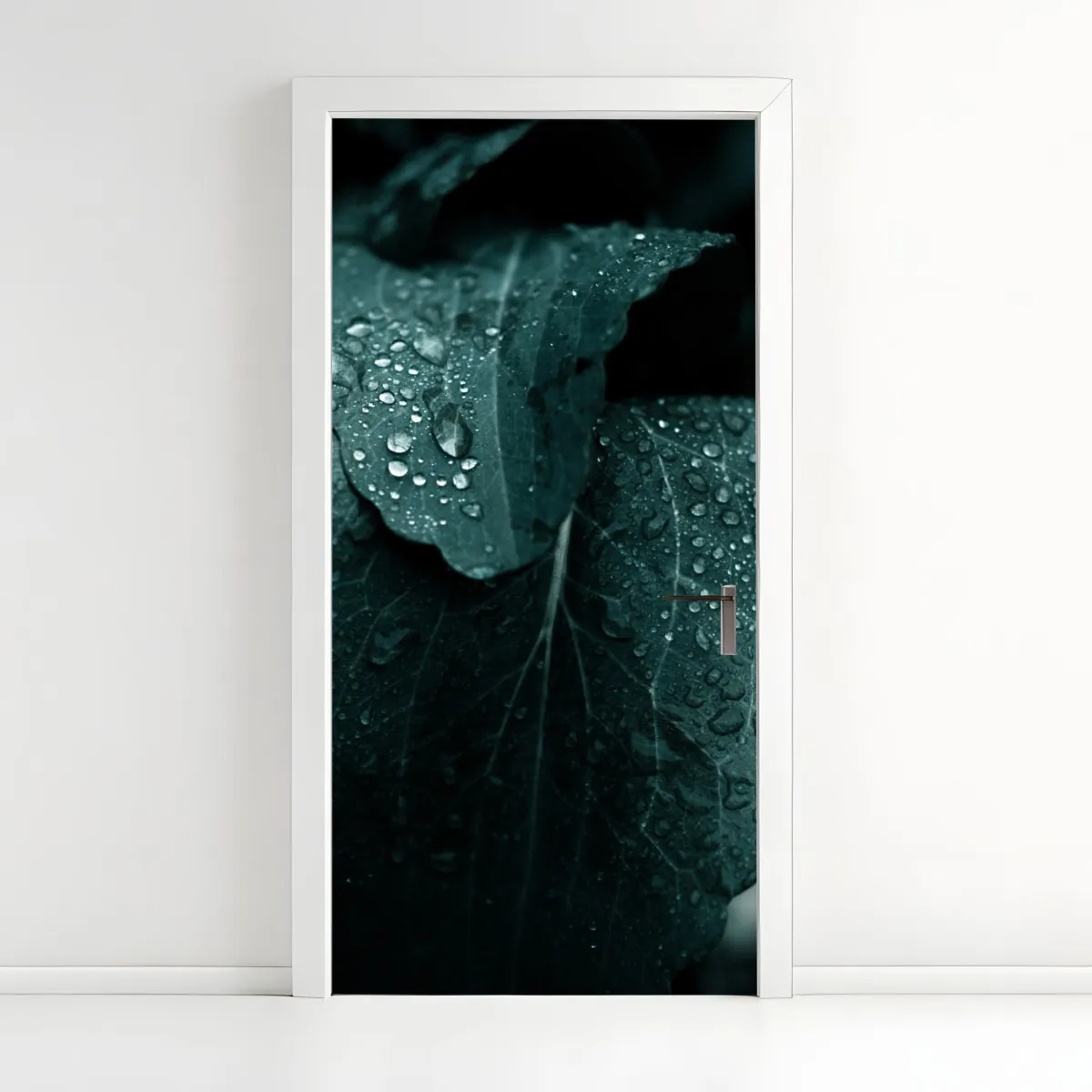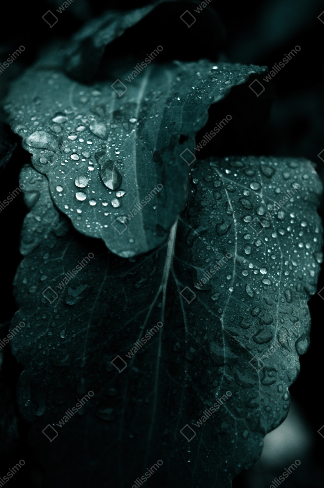 Bringen Sie Ruhe und natürliche Textur in Ihr Zuhause mit dieser Nahaufnahme von Tautropfen auf Blättern in beruhigenden türkisfarbenen Tönen.