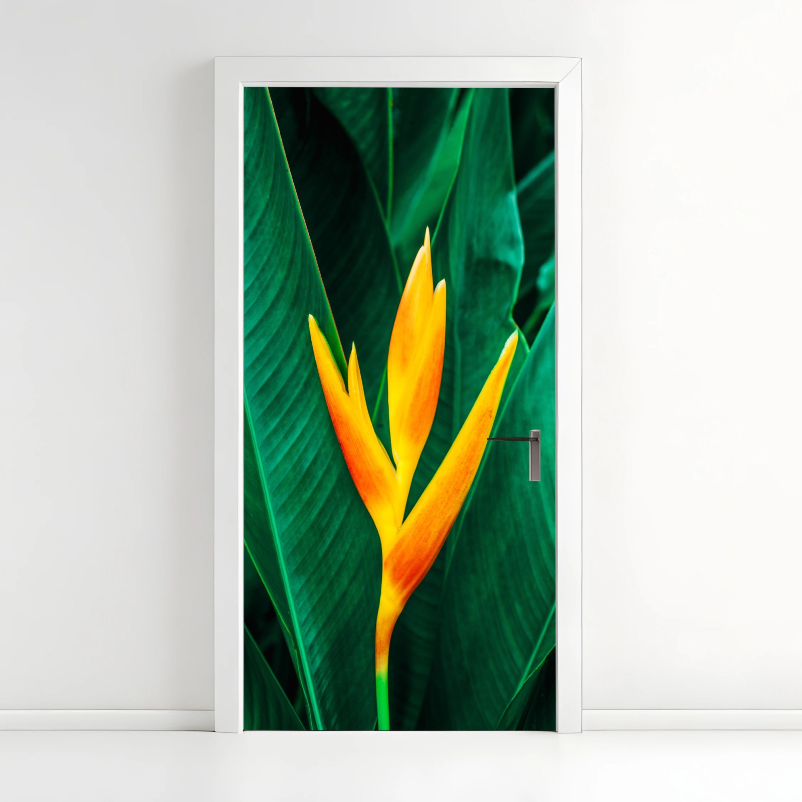 Türaufkleber Leuchtende tropische heliconia vor satten grünen blättern