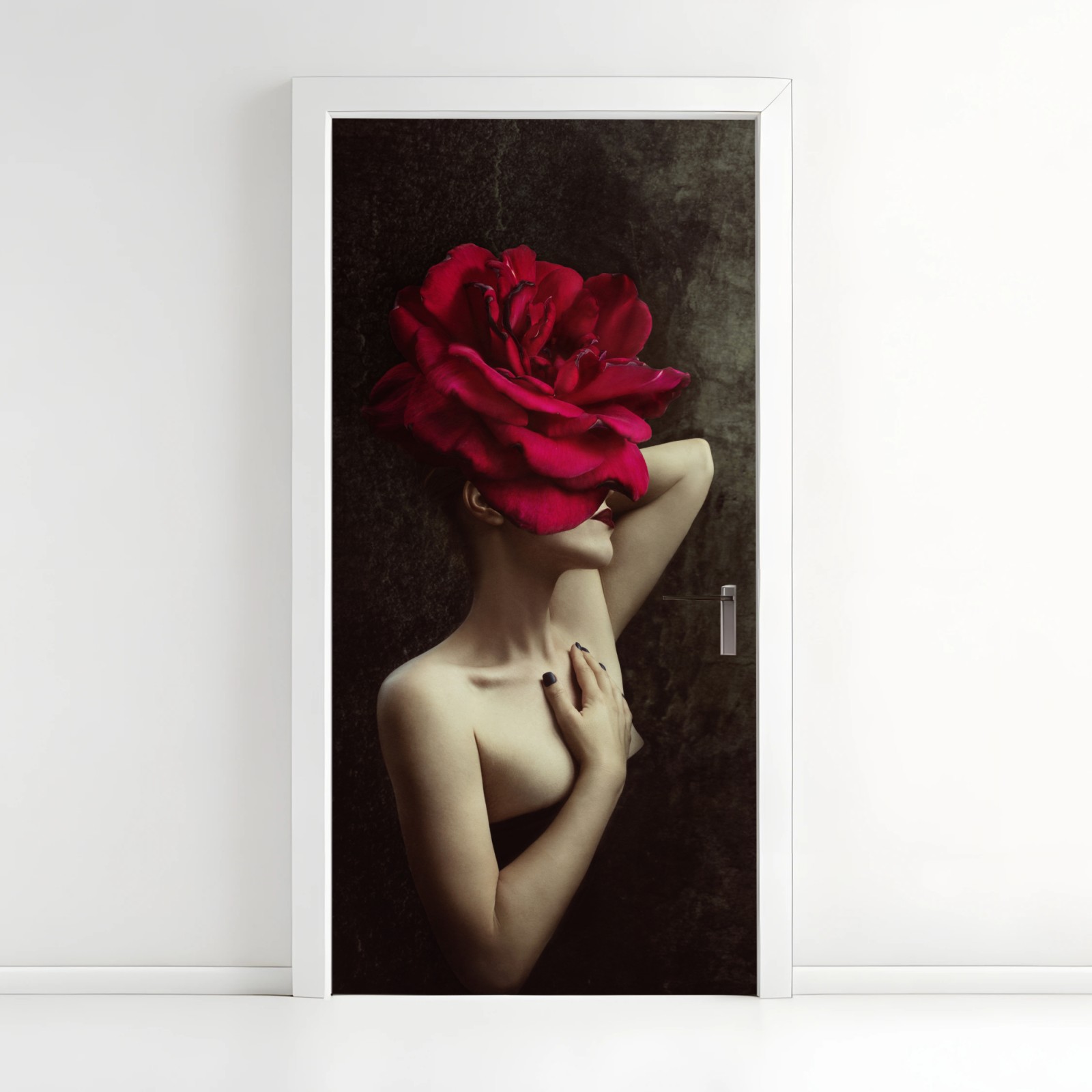 Türaufkleber Frau mit rosenkopf surreales blumenporträt