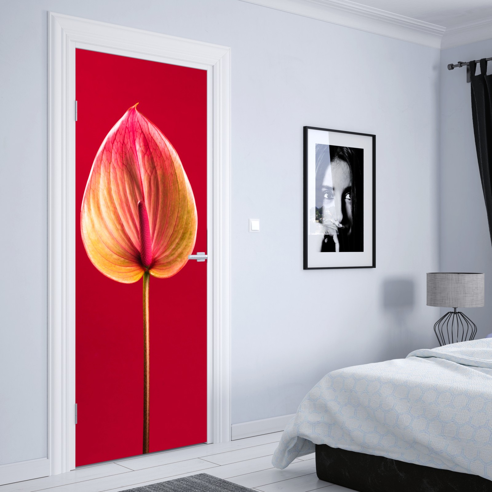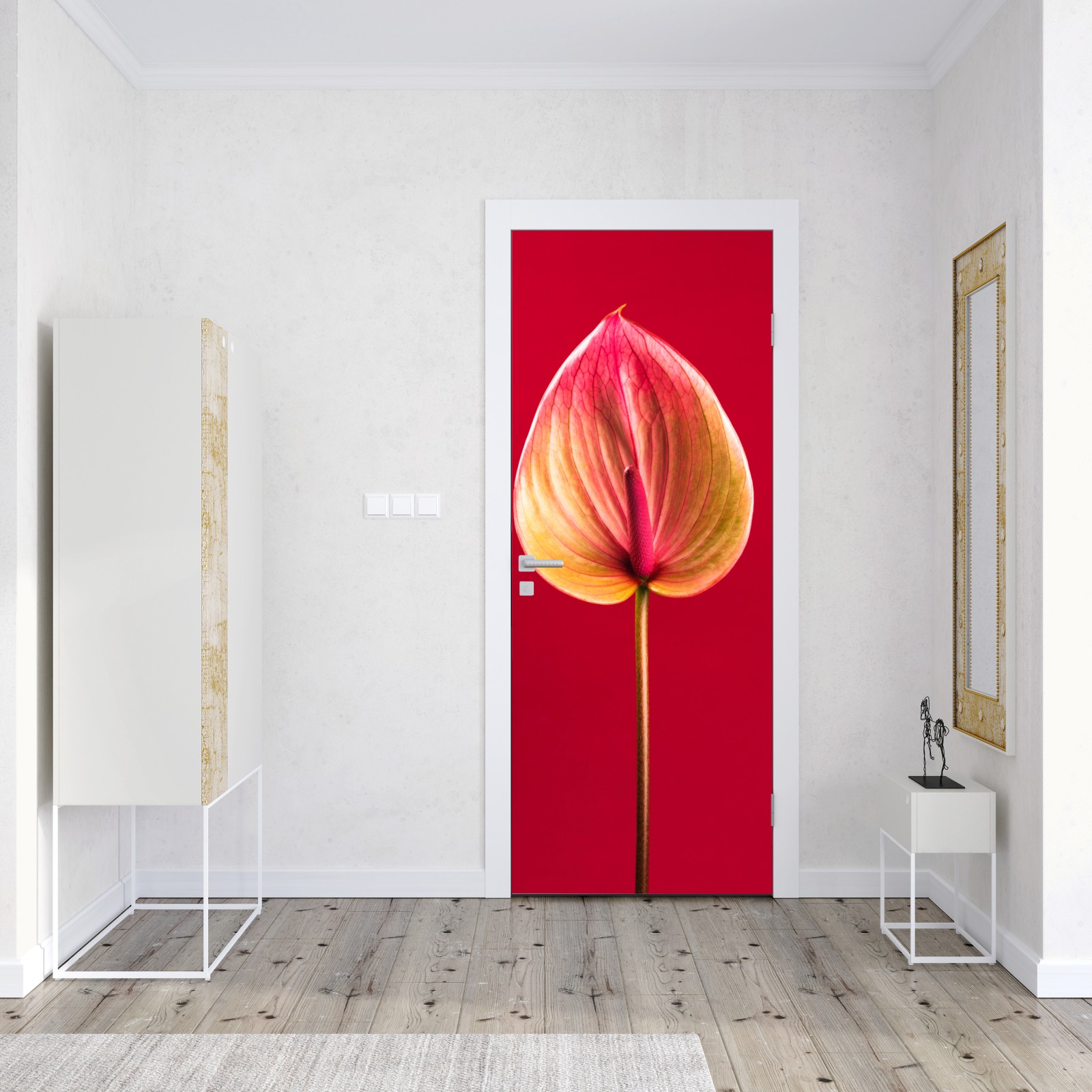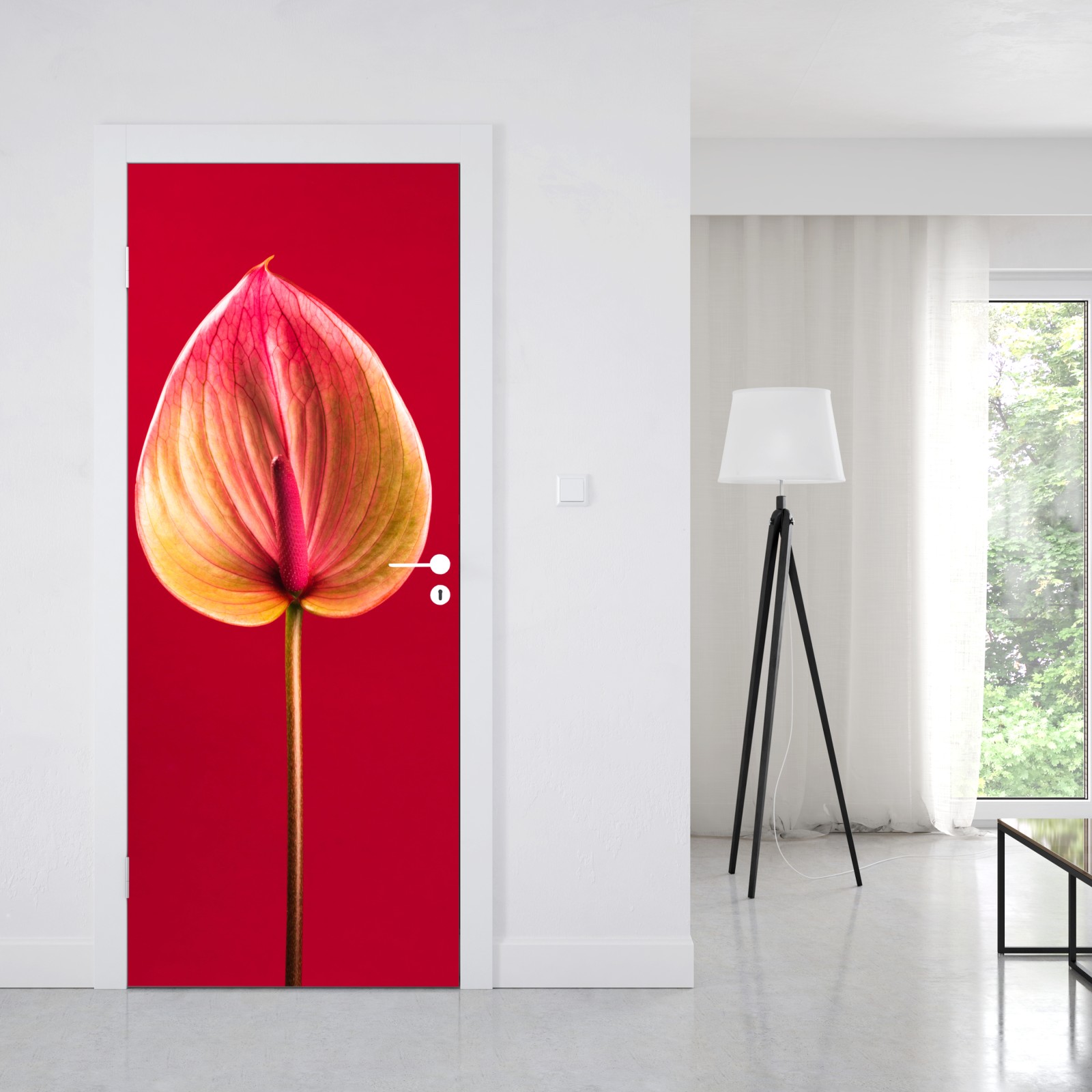 Türaufkleber elegantes anthurium vor rotem hintergrund