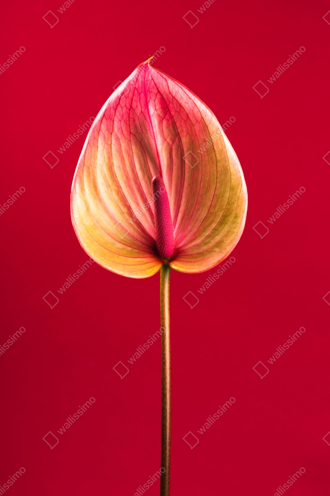 Bringen Sie kühne botanische Eleganz in den Raum mit einer minimalistischen Nahaufnahme eines einzelnen Anthuriums vor lebhaft rotem Hintergrund.