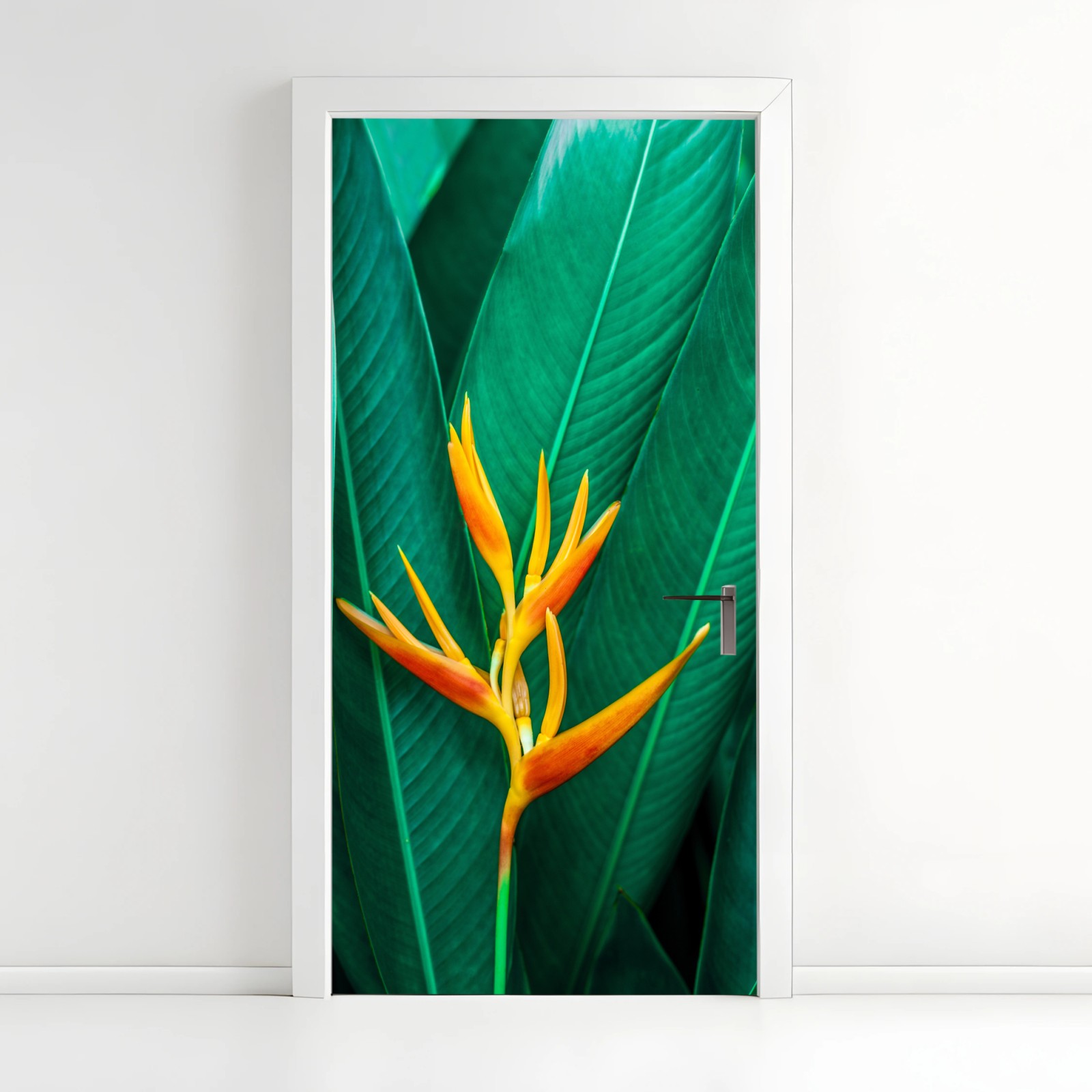 Türaufkleber Leuchtende tropische paradiesvogelblume auf grünen blättern