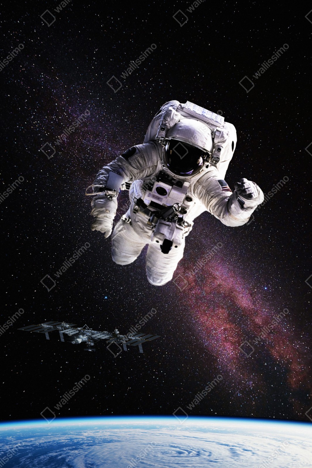 Erleben Sie das Wunder des Weltraums mit diesem beeindruckenden Bild eines Astronauten, der über der Erde vor einem lebendigen Sternenhintergrund schwebt.