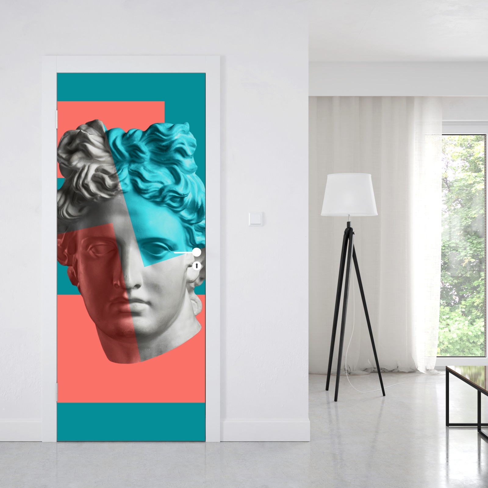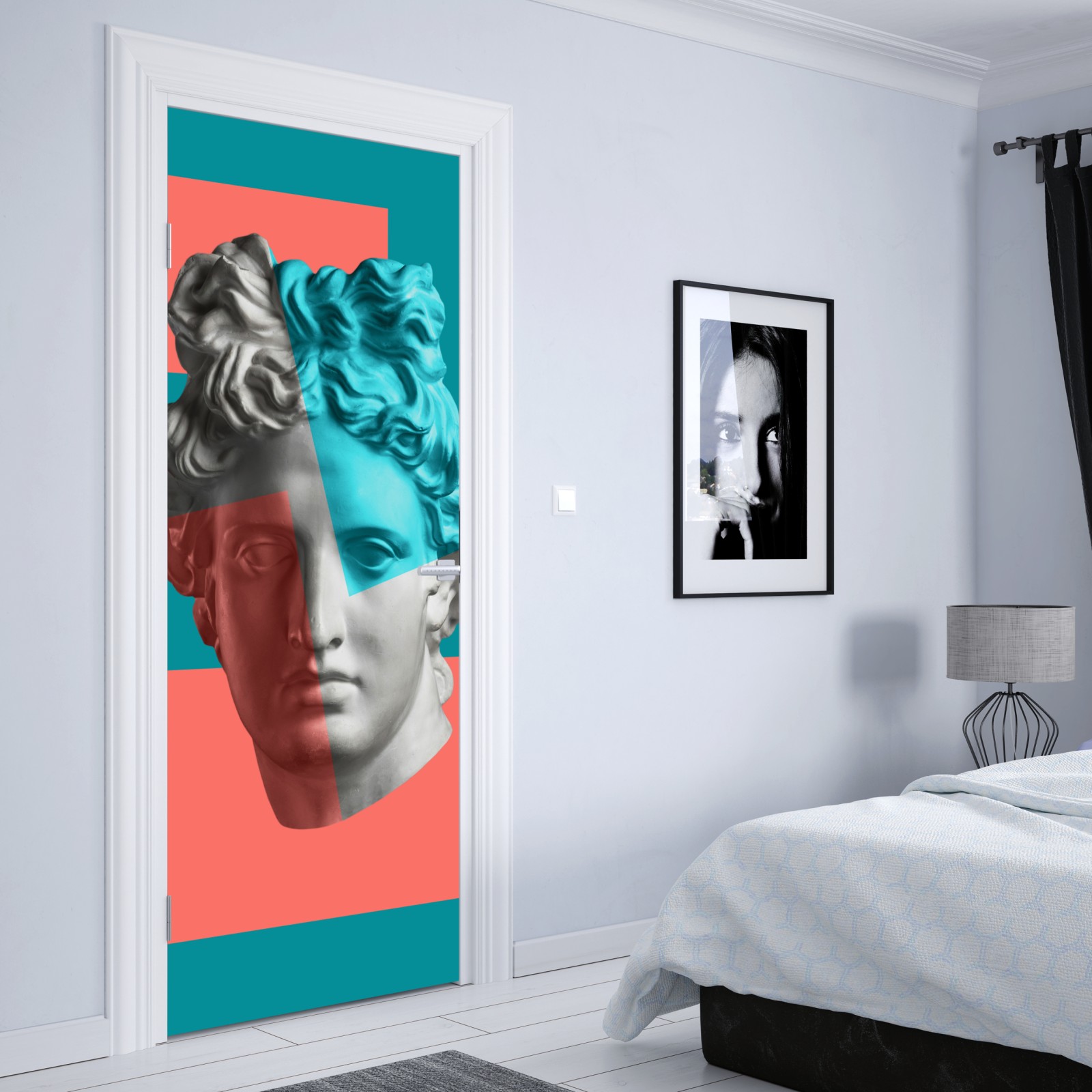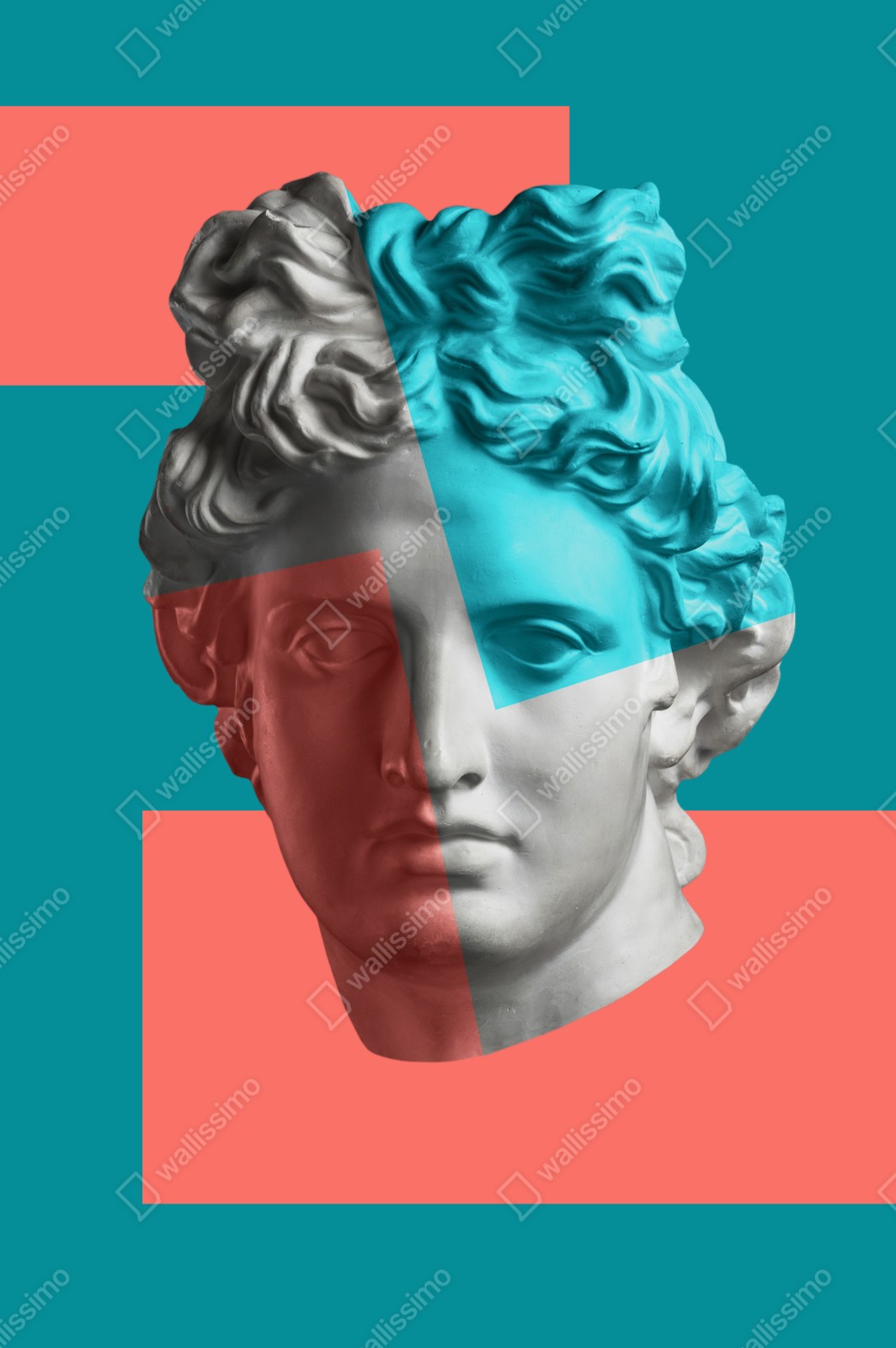 Setzen Sie einen kühnen modernen Akzent in Ihrem Raum mit dieser Duotone-Collage einer klassischen Büste in kräftigem Türkis und Koralle.
