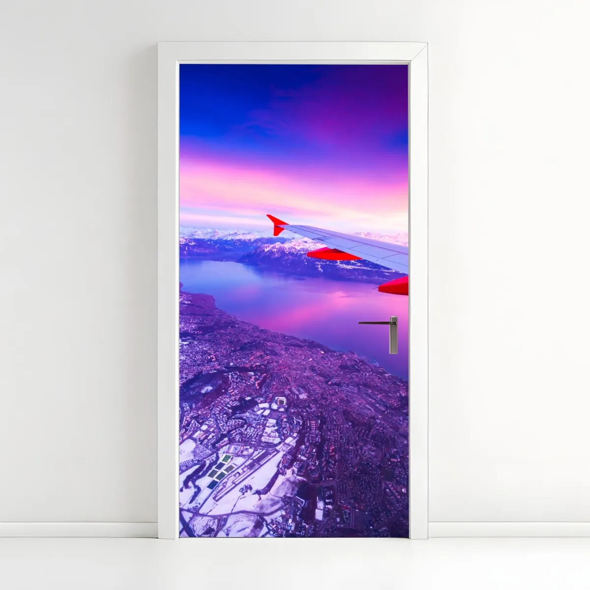 Türaufkleber luftaufnahme einer stadt am see bei sonnenuntergang