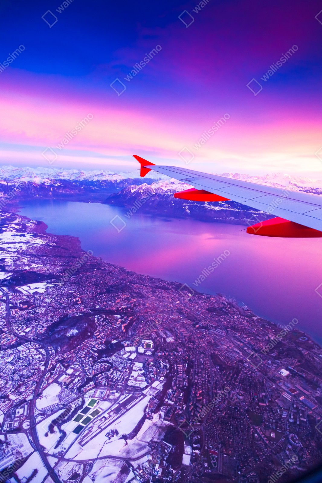 Verleihen Sie Ihrem Raum eine lebendige Luftaufnahme einer Stadt am See und einer Bergkulisse, aufgenommen aus dem Flugzeugfenster.