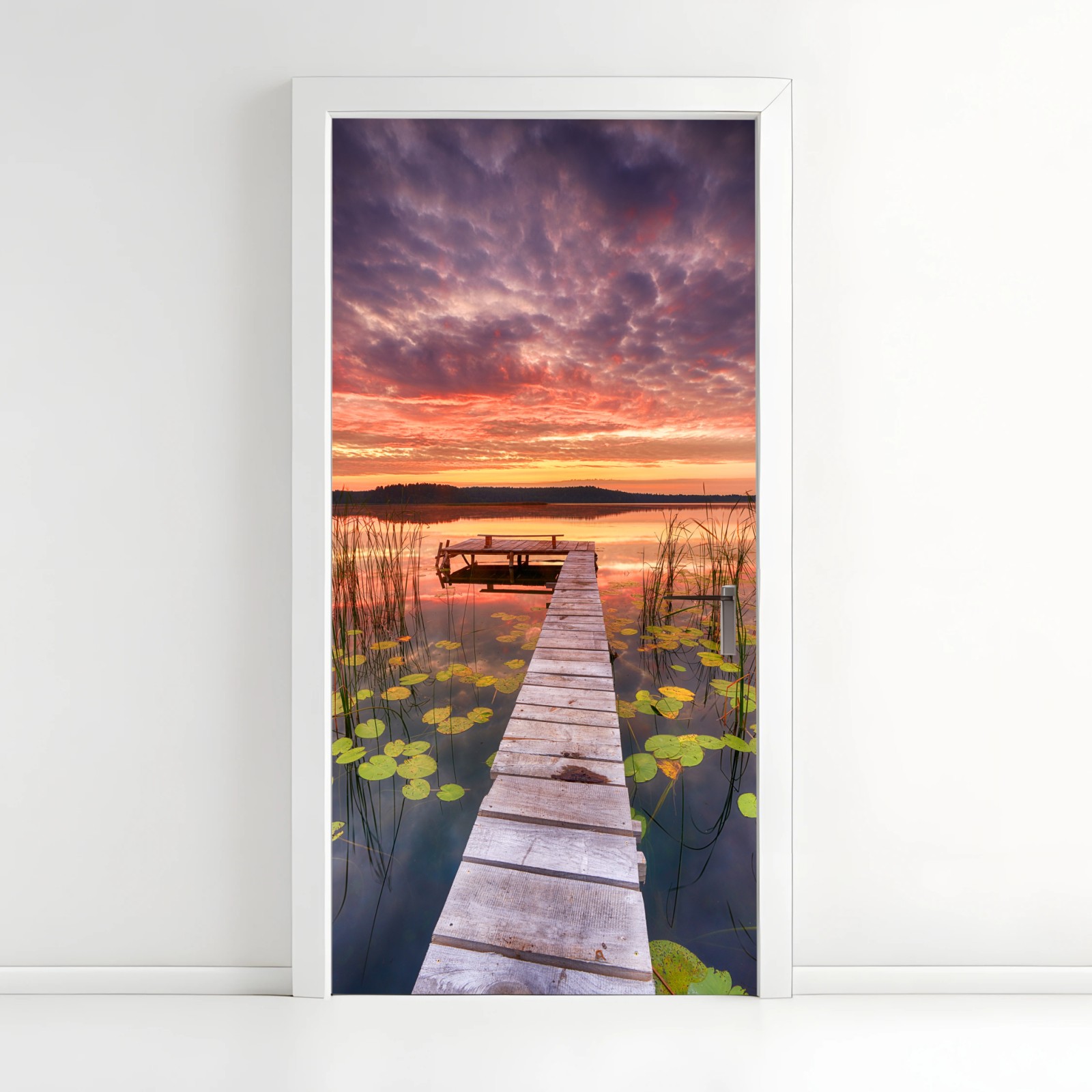 Türaufkleber Sonnenaufgang über ruhigem see mit steg
