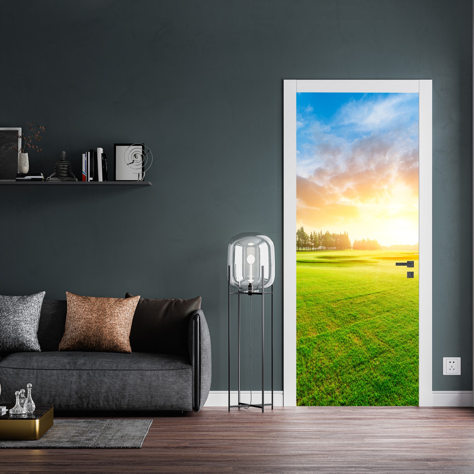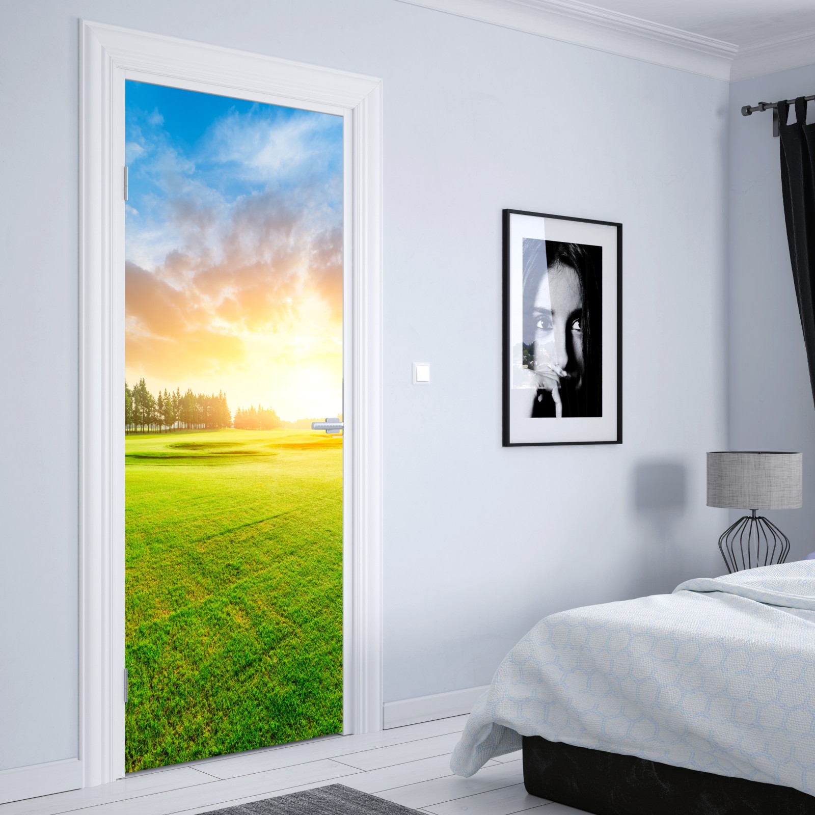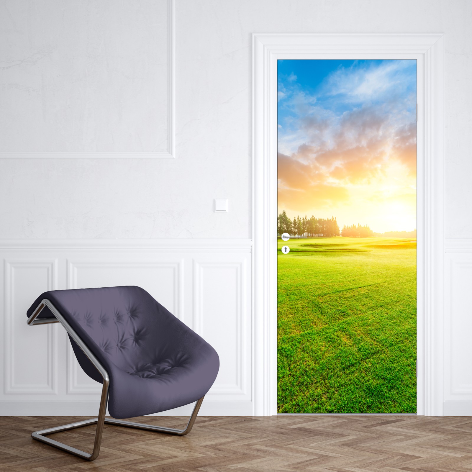 Türaufkleber sonnenbeschienene wiese und wald bei sonnenaufgang