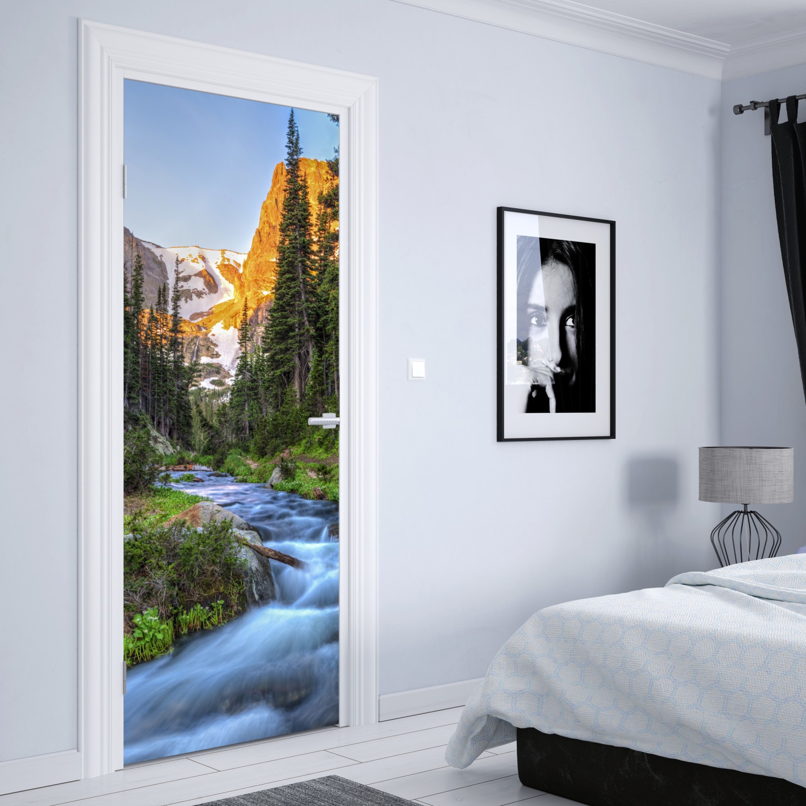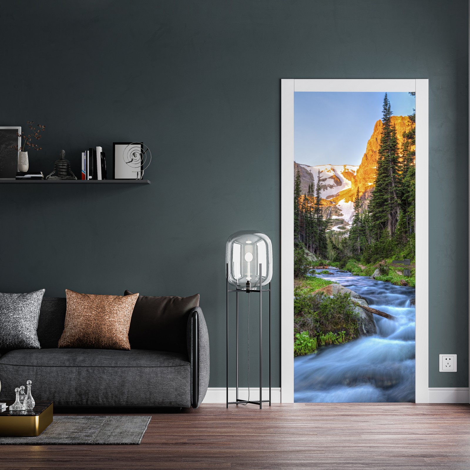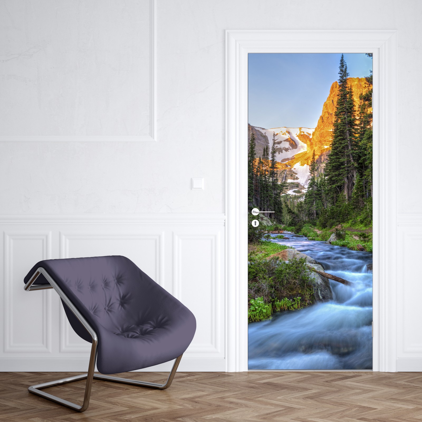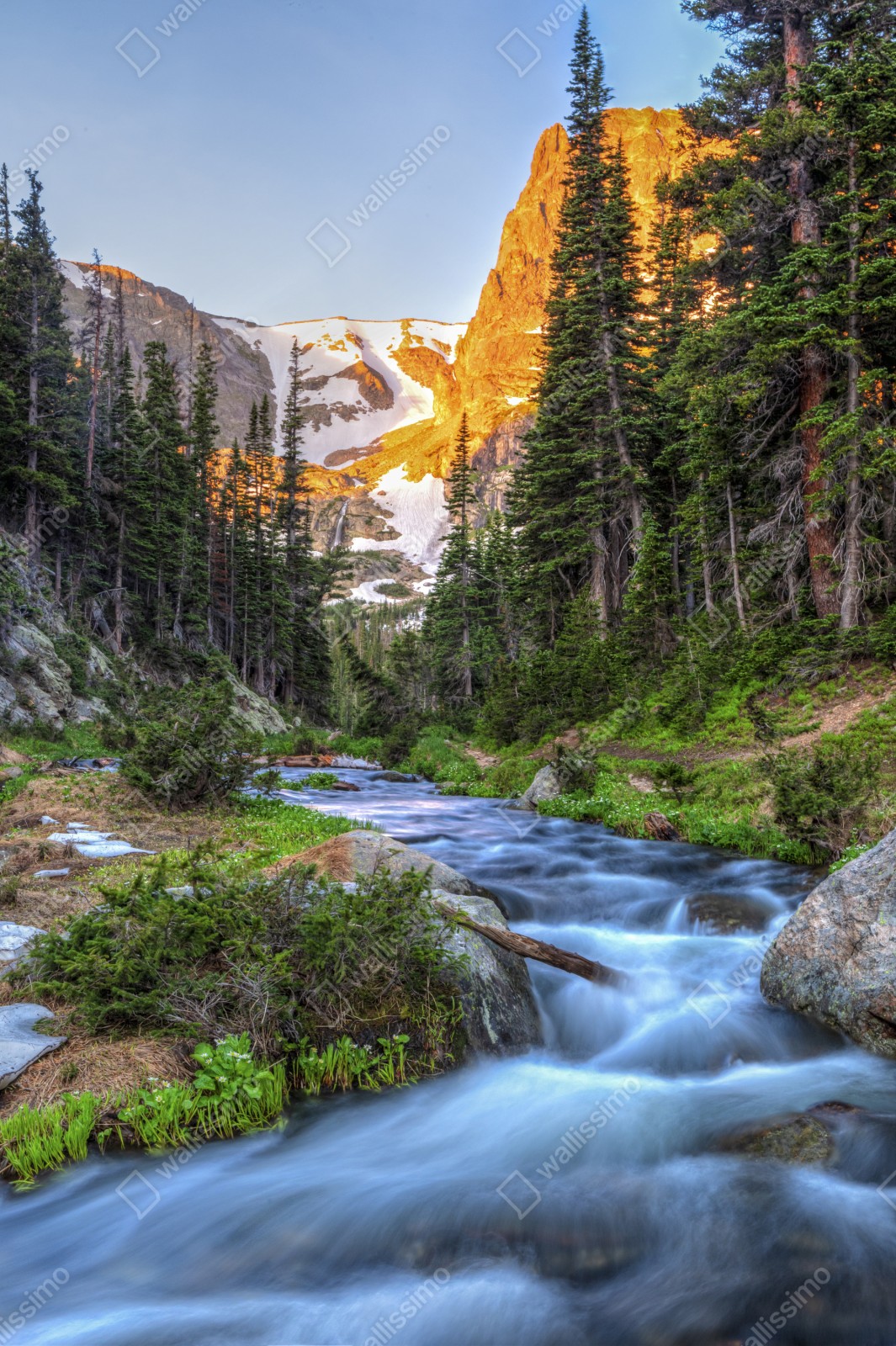 Erleben Sie ruhige Berglandschaft mit warmem Licht auf schroffen Gipfeln und einem fließenden Alpenbach, ideal, um natürliche Ruhe in Ihr Zuhause zu bringen.