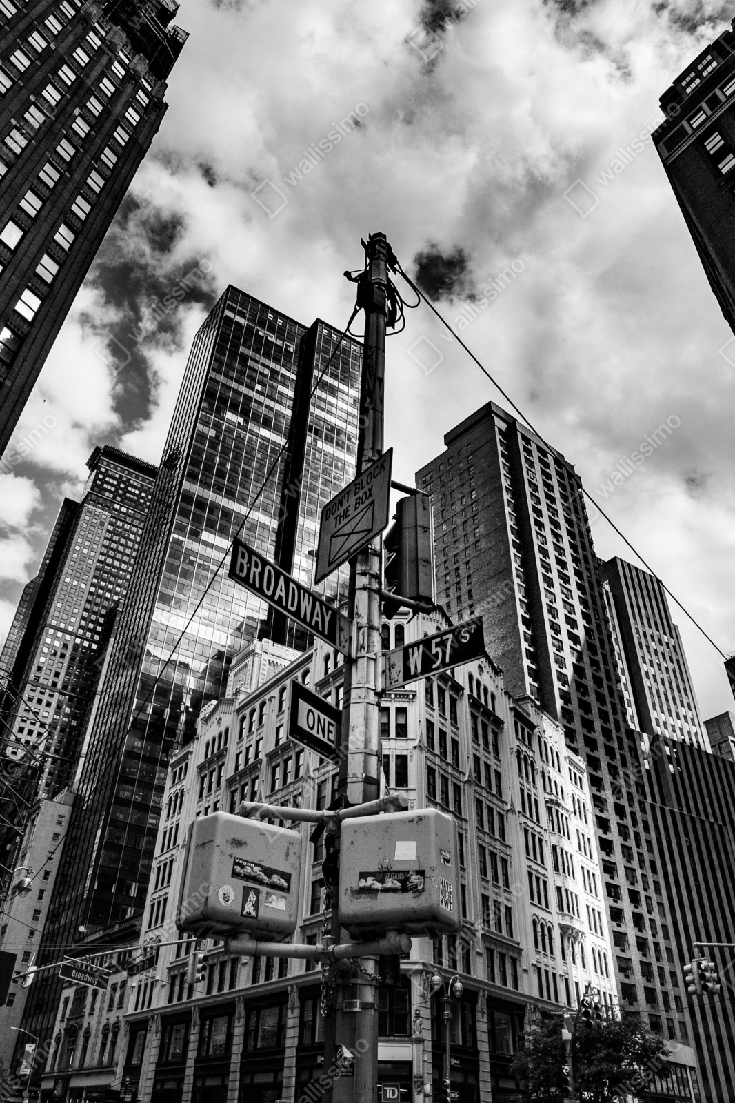 Verleihen Sie Ihrem Raum urbane Dramatik mit dieser schwarz-weiß-Aufnahme von Broadway und W 57 St, mit hohen Wolkenkratzern und stimmungsvollem Himmel.