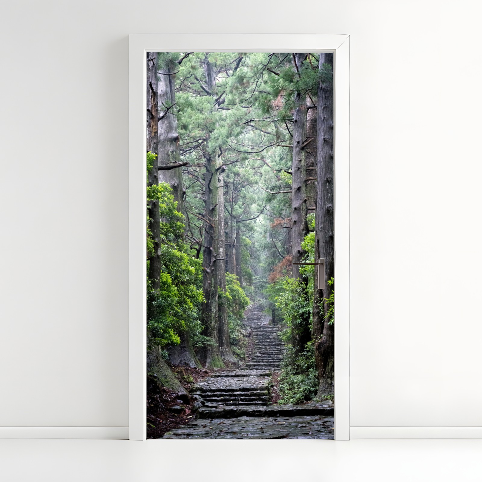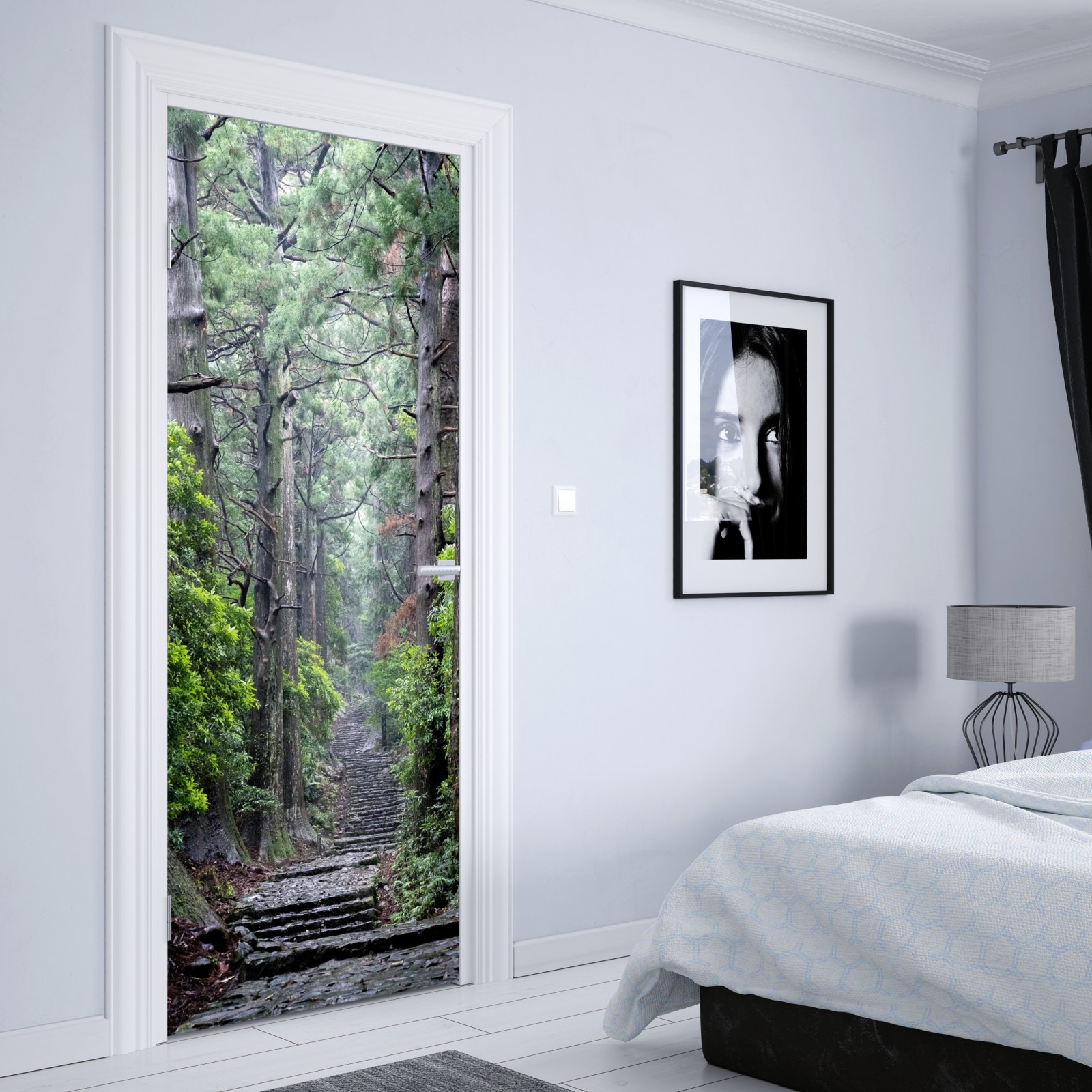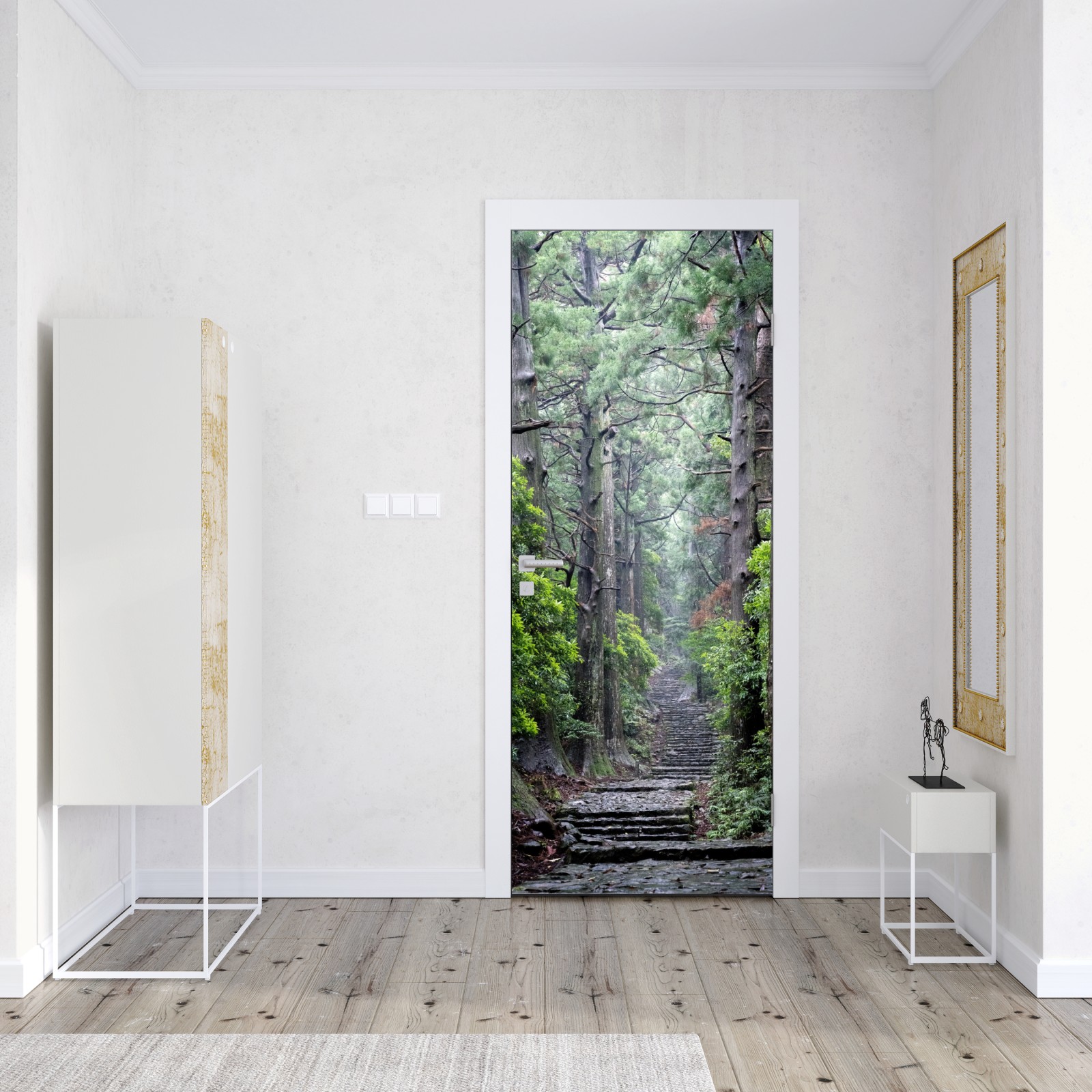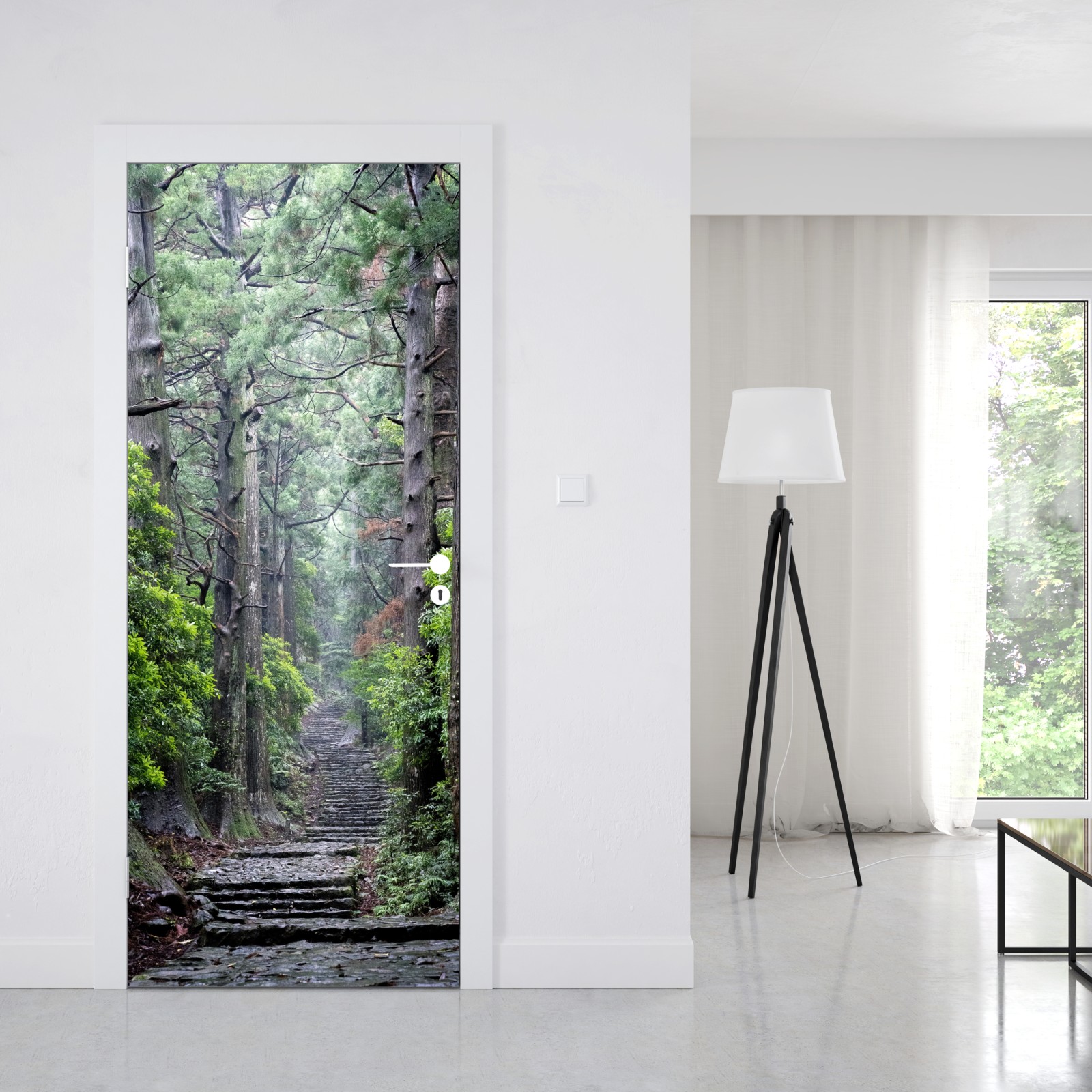 Türaufkleber mystischer waldweg zwischen alten bäumen