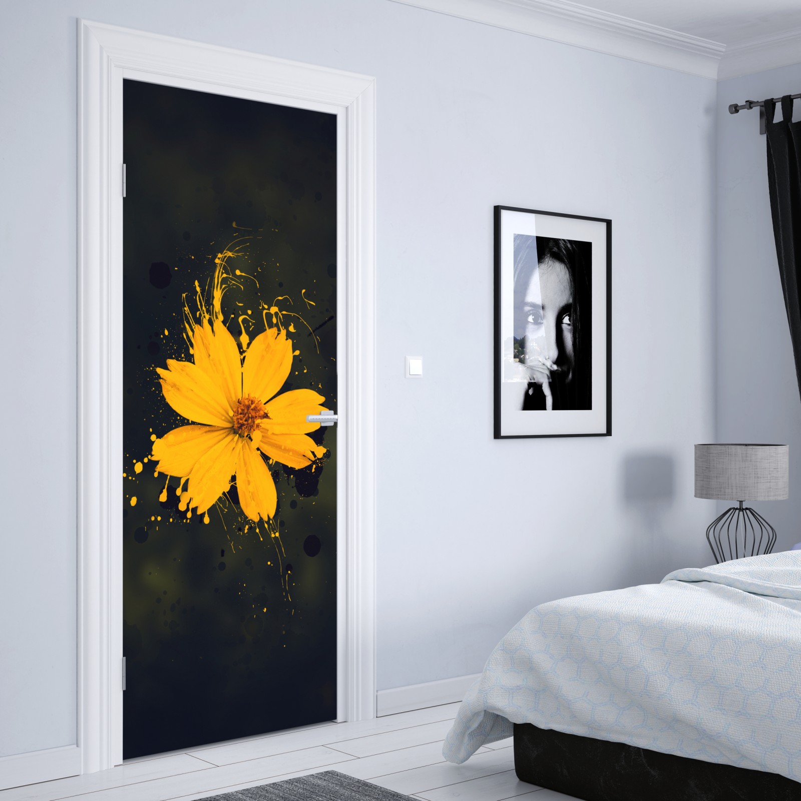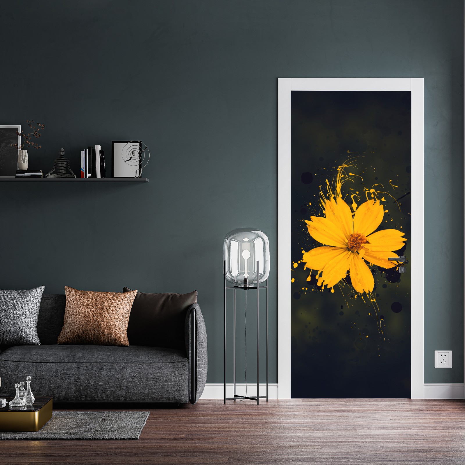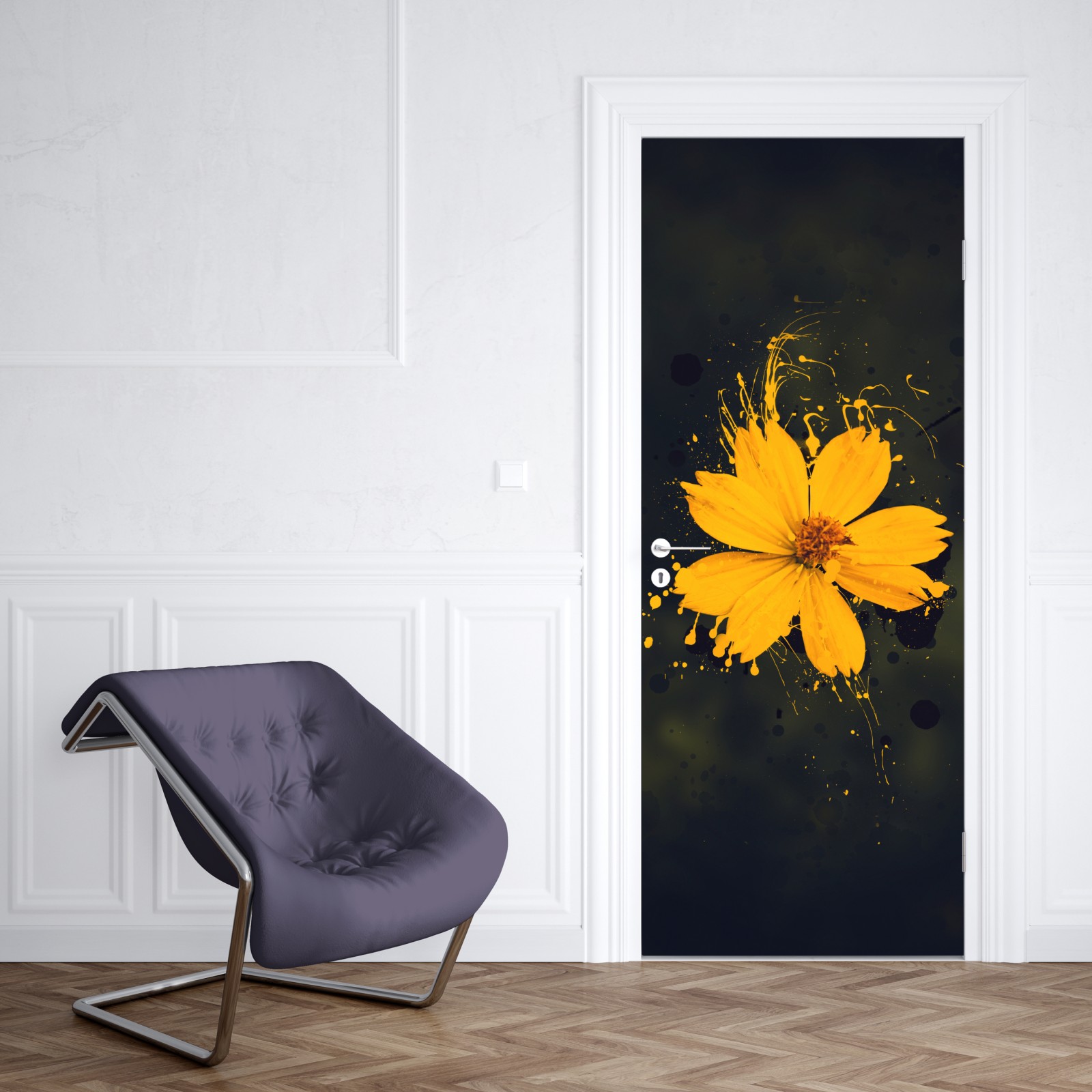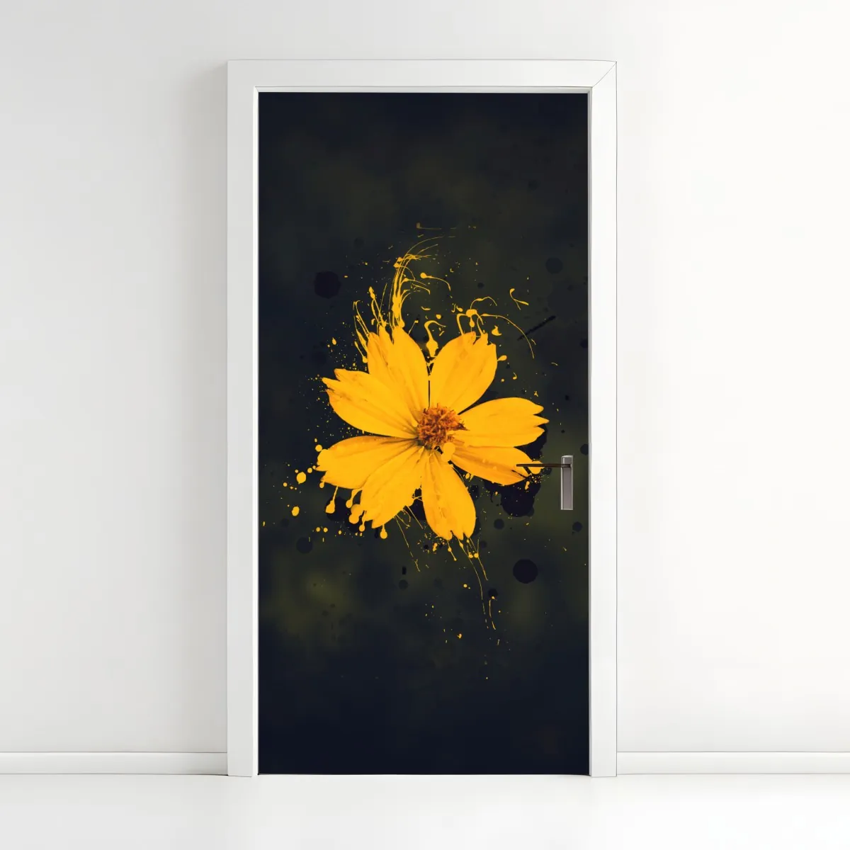 Türaufkleber leuchtende gelbe blüte auf dunklem hintergrund