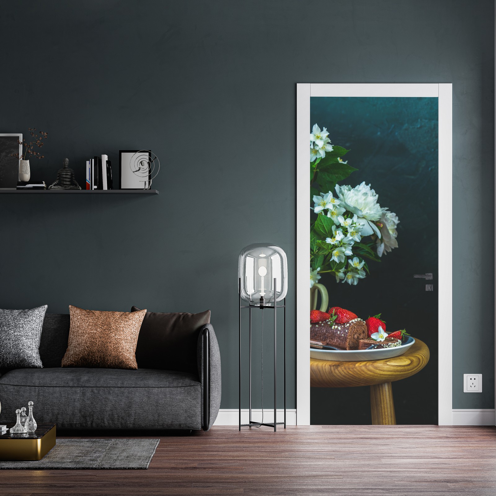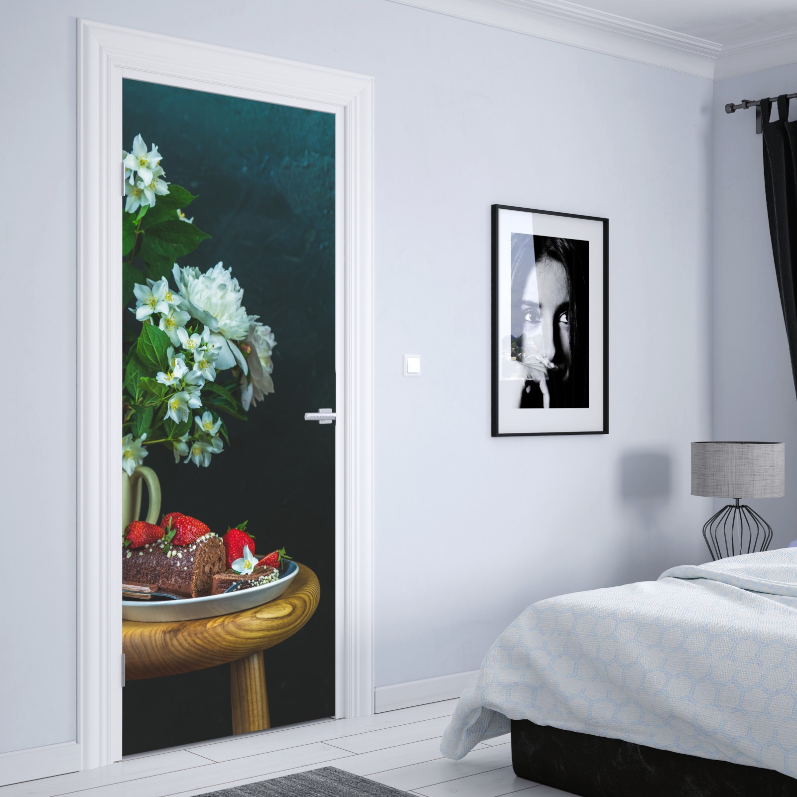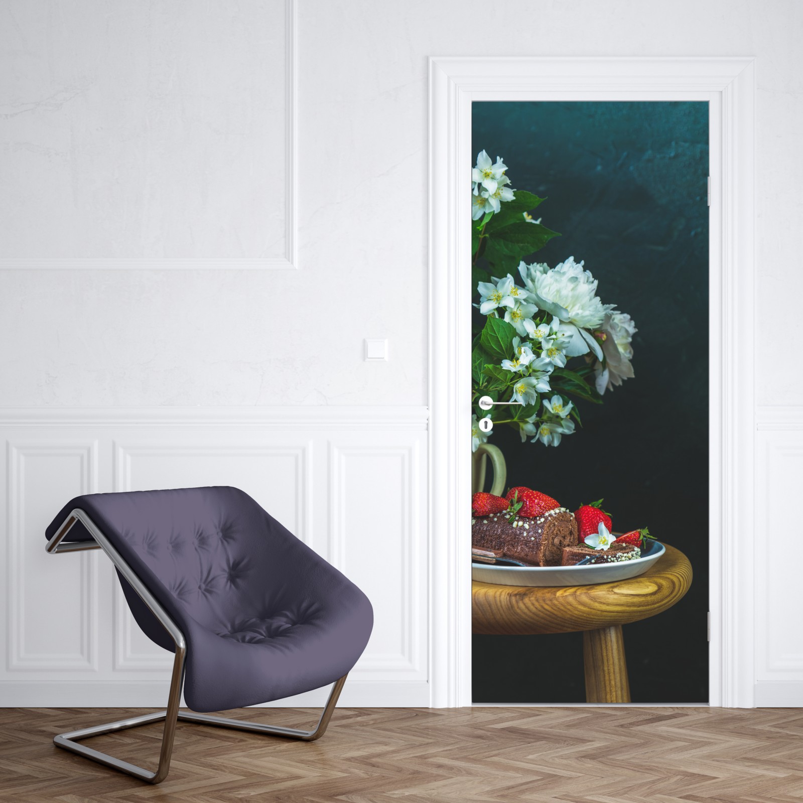 Türaufkleber schokoladenrolle mit erdbeeren und weißen blüten