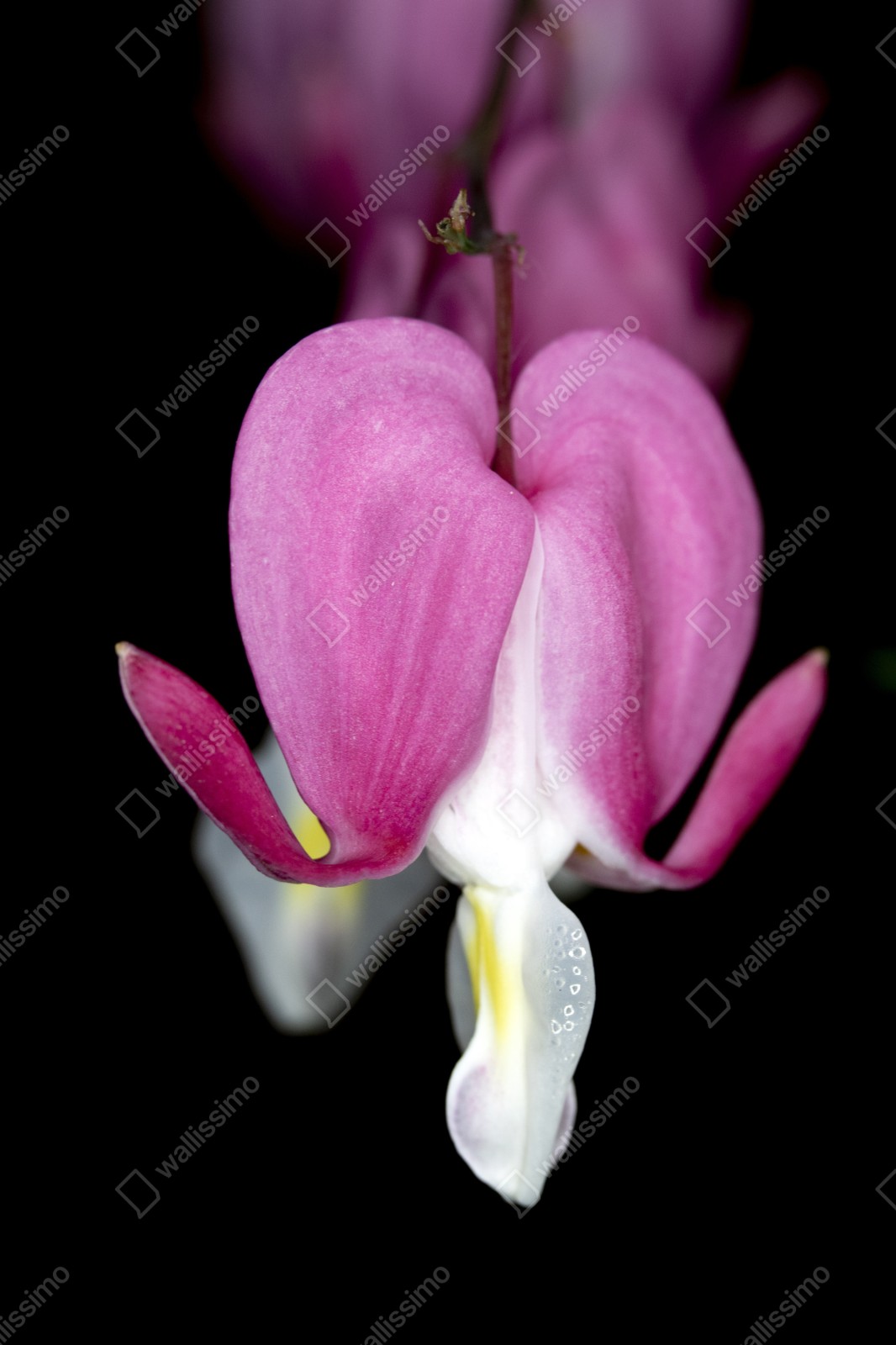 Bringen Sie botanische Eleganz in Ihr Zuhause mit dieser beeindruckenden Nahaufnahme einer rosa Herzblüte vor schwarzem Hintergrund.