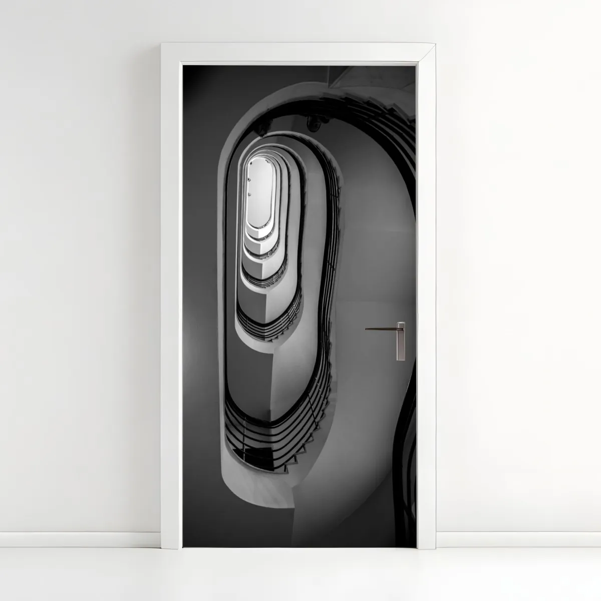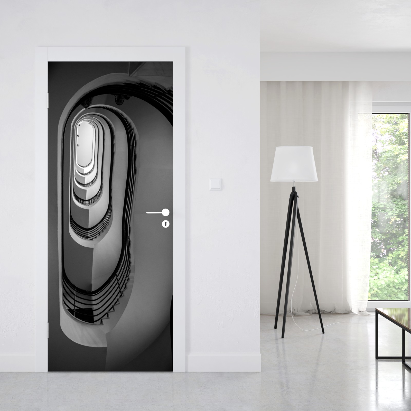 Türaufkleber spiraltreppe perspektive in schwarzweiß