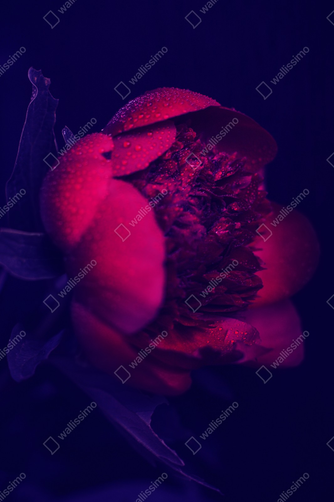 Stimmungsvolle Nahaufnahme einer rosa Pfingstrose mit Tautropfen und tiefvioletten Tönen, ideal zur Verschönerung von Wohnräumen.