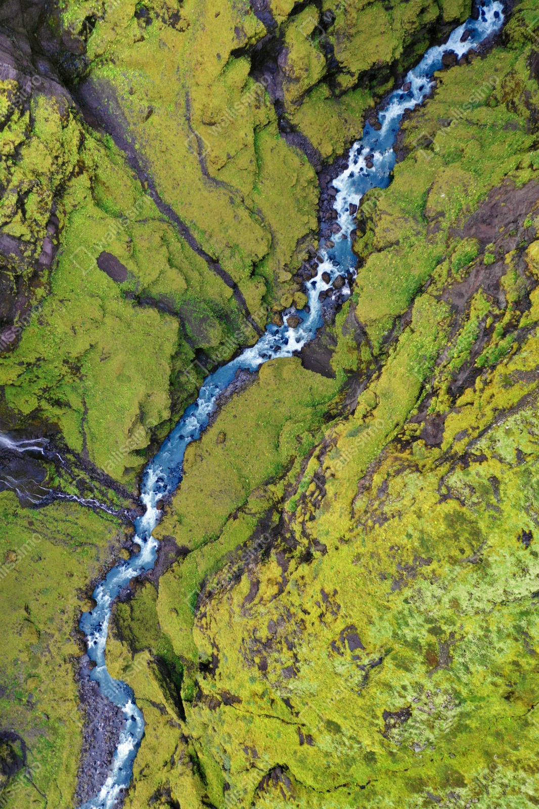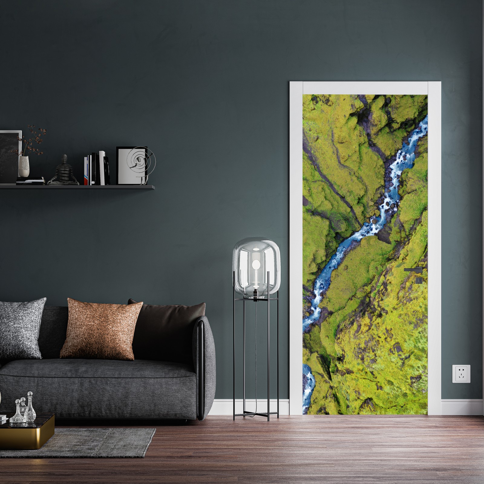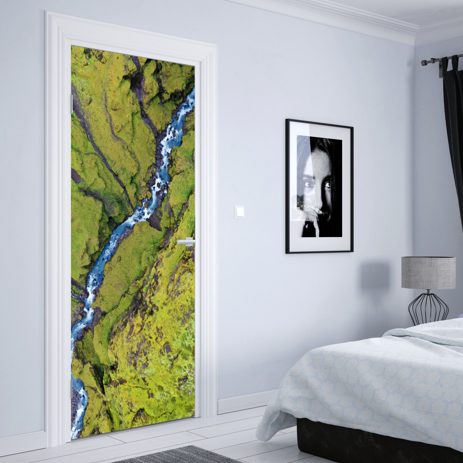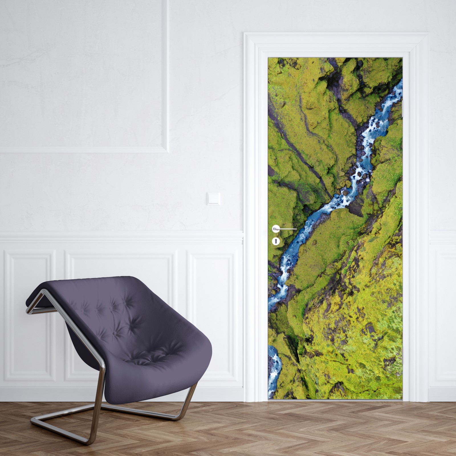 Türaufkleber luftaufnahme: fluss in moosbedeckter schlucht
