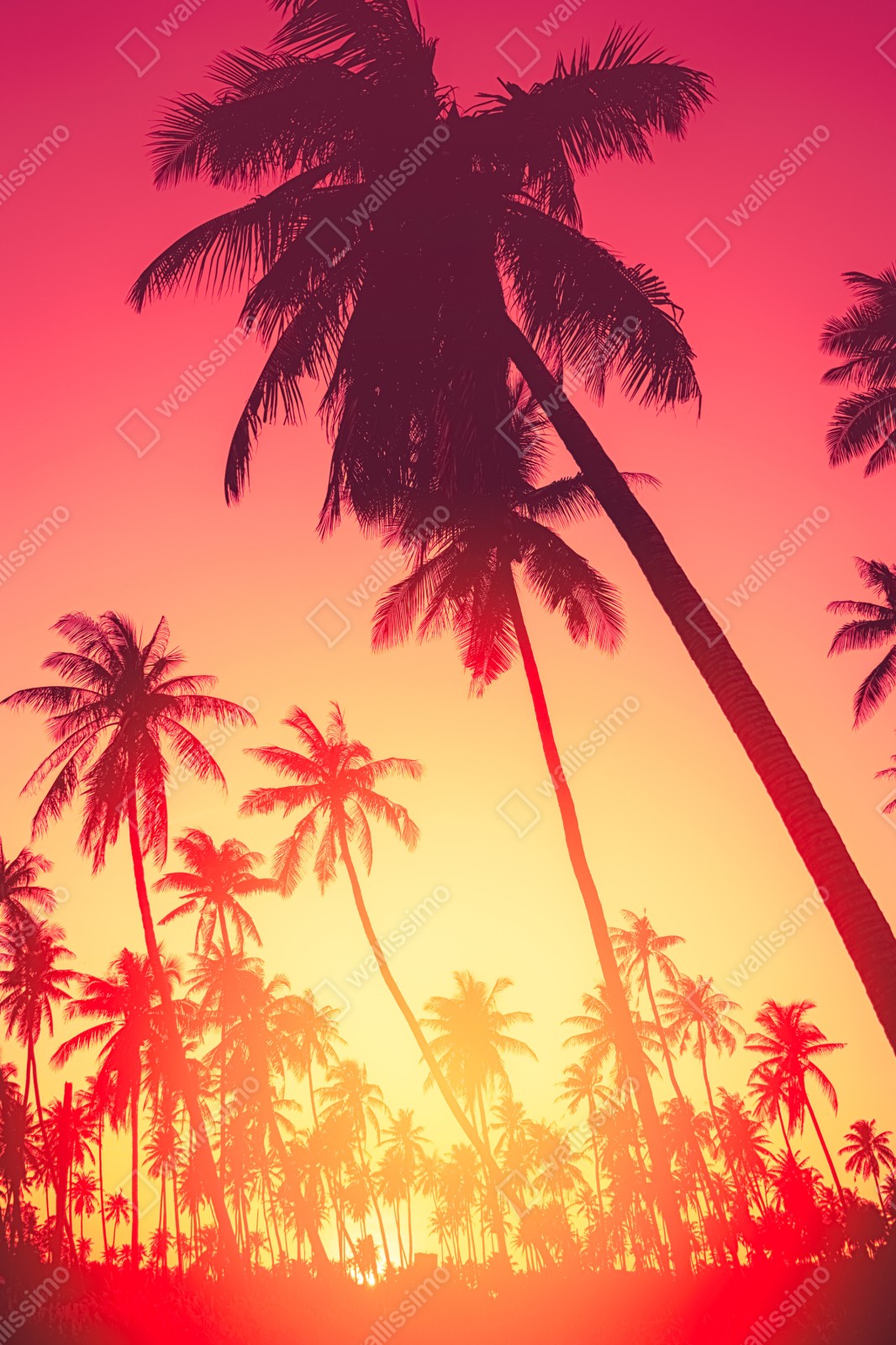 Bringen Sie tropische Stimmung in Ihr Zuhause mit diesem lebendigen Sonnenuntergangsbild mit Palmen und einem traumhaften rosa-orangen Farbverlauf.