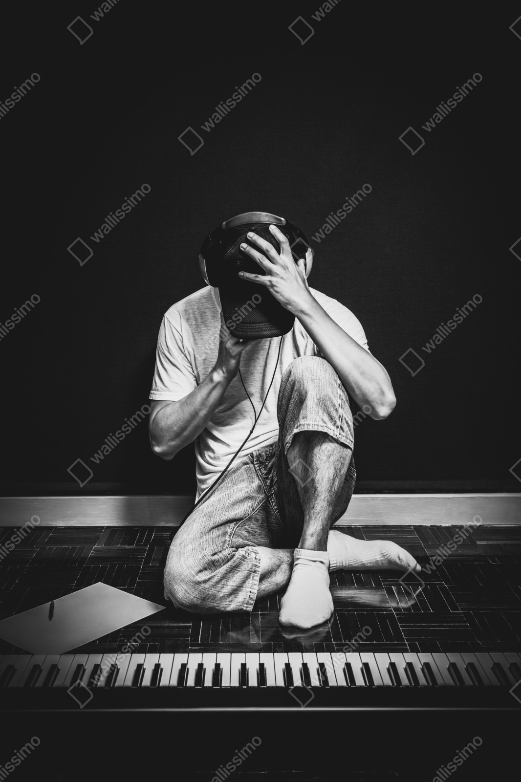 Bringen Sie atmosphärische, monochrome Musikvibes in Ihr Zuhause mit diesem stimmungsvollen Porträt eines Musikers am Keyboard.