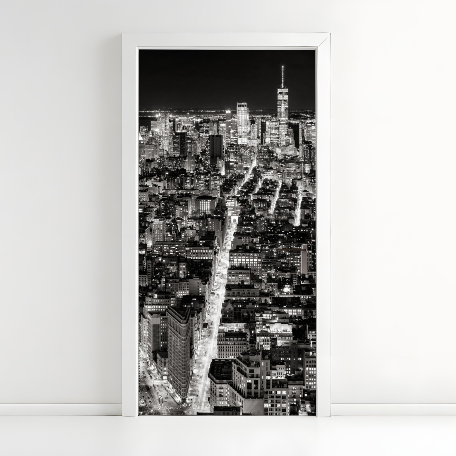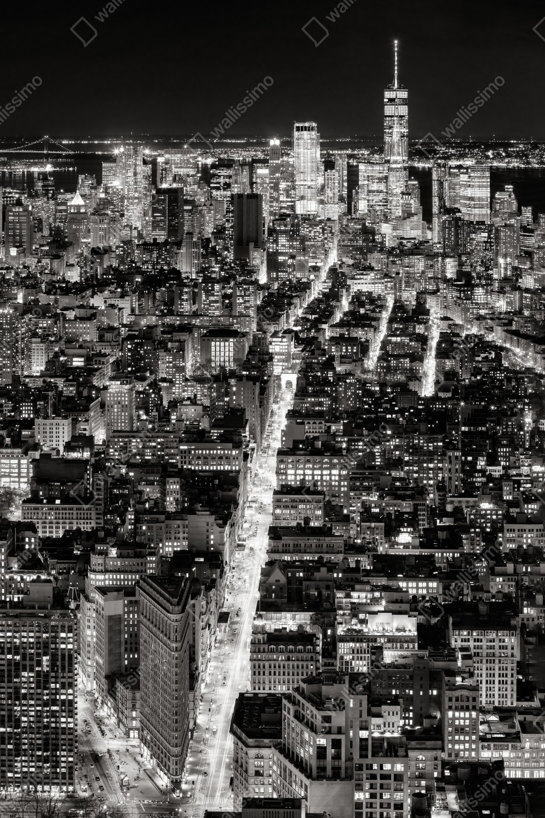 Erleben Sie die zeitlose Eleganz einer monochromen Stadtansicht bei Nacht mit klaren architektonischen Details und leuchtenden Straßenlichtern.