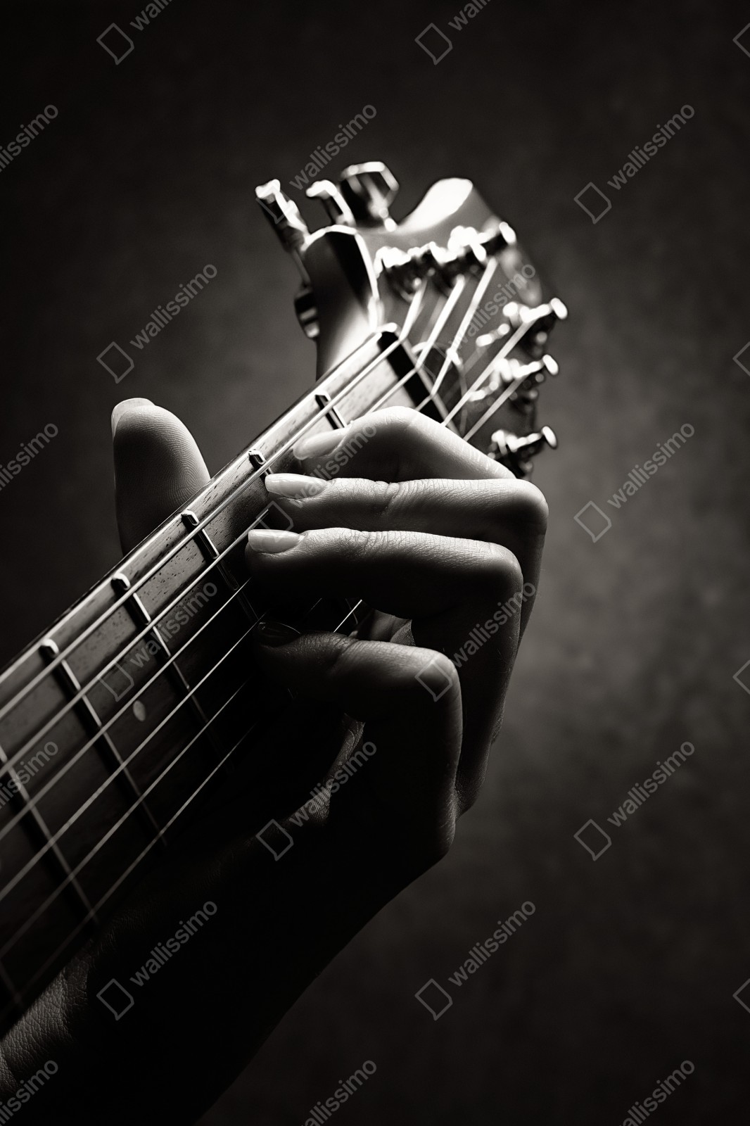 Fangen Sie die Seele der Musik mit diesem dramatischen schwarzweißbild einer Gitarrenhand auf dem Griffbrett ein.