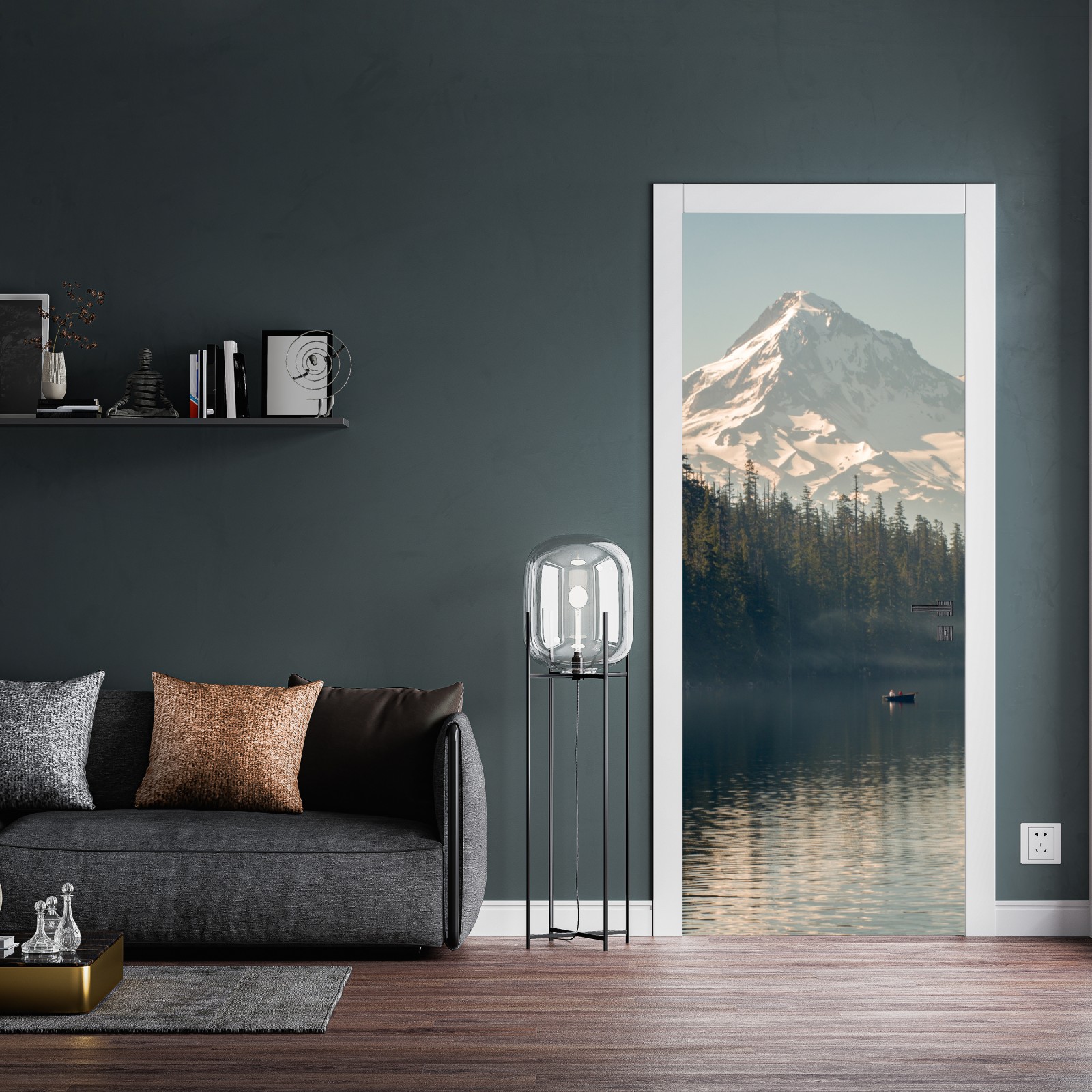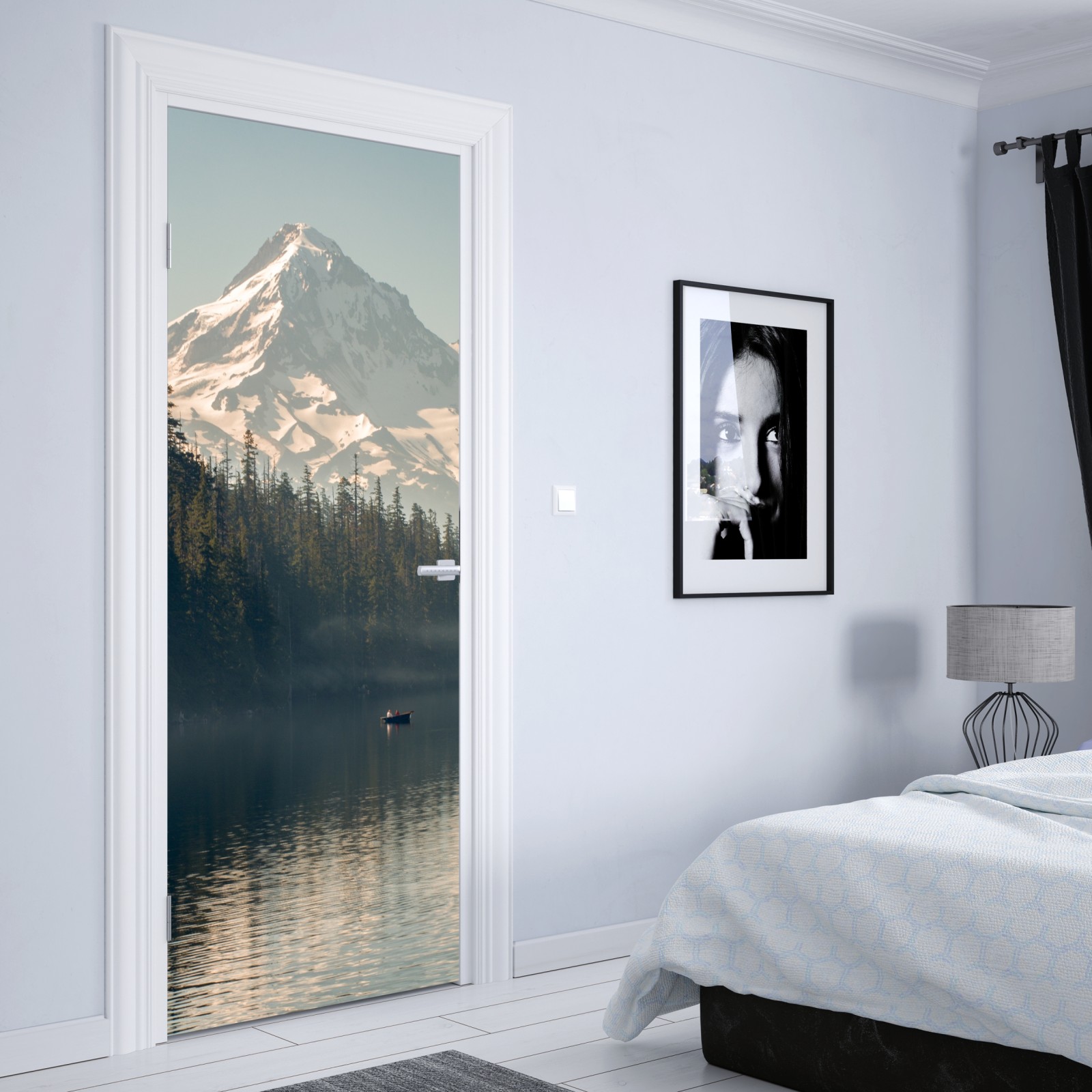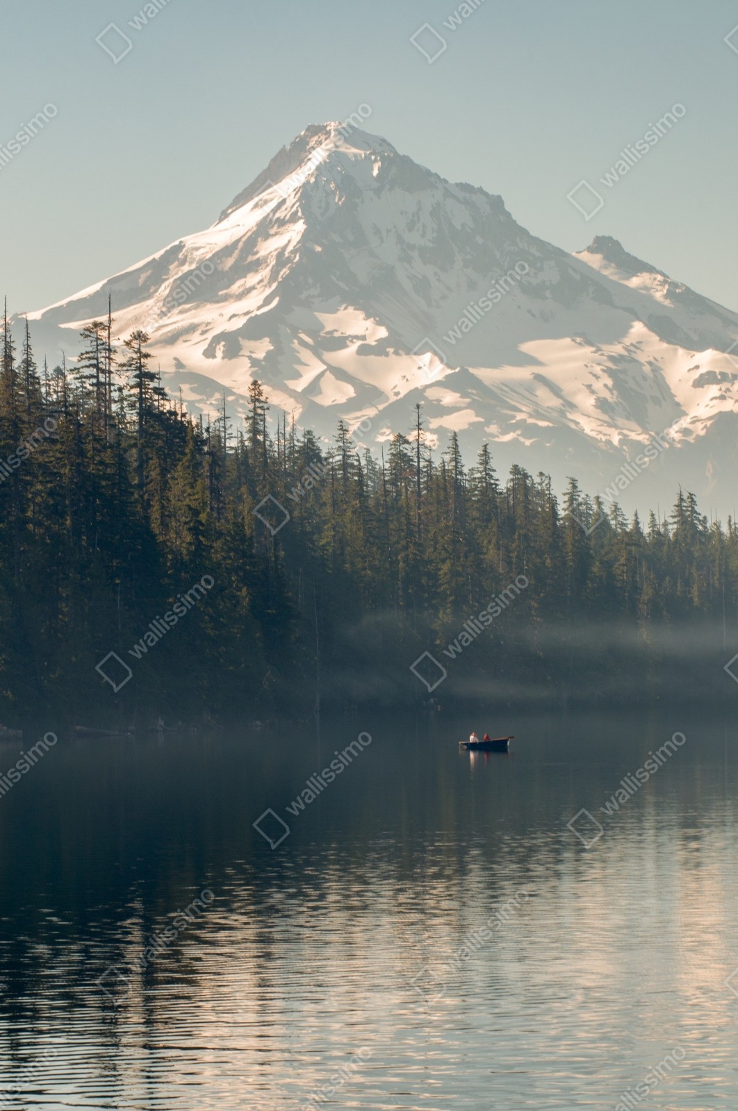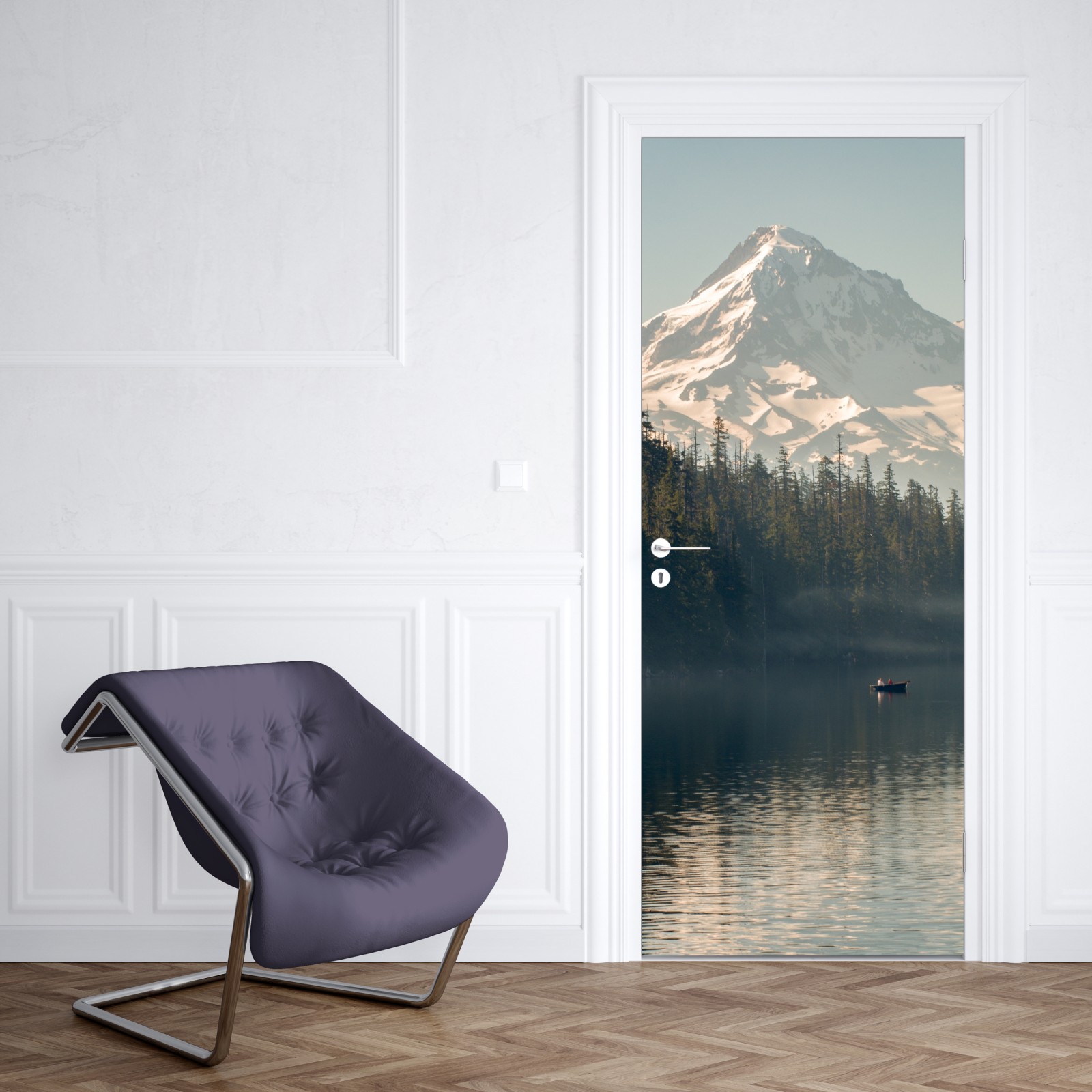 Bringen Sie Ruhe und natürliche Schönheit in Ihr Zuhause mit diesem majestätischen, schneebedeckten Berg, der sich im ruhigen See spiegelt.