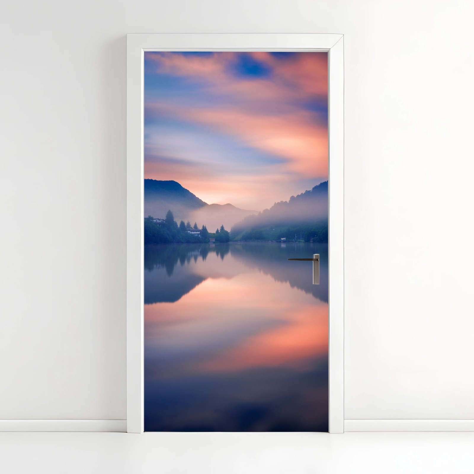 Türaufkleber Nebeliger bergsee bei dämmerung