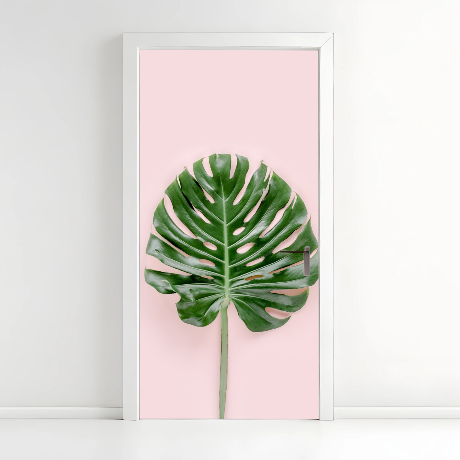 Türaufkleber Monstera-blatt auf pastell-rosa hintergrund