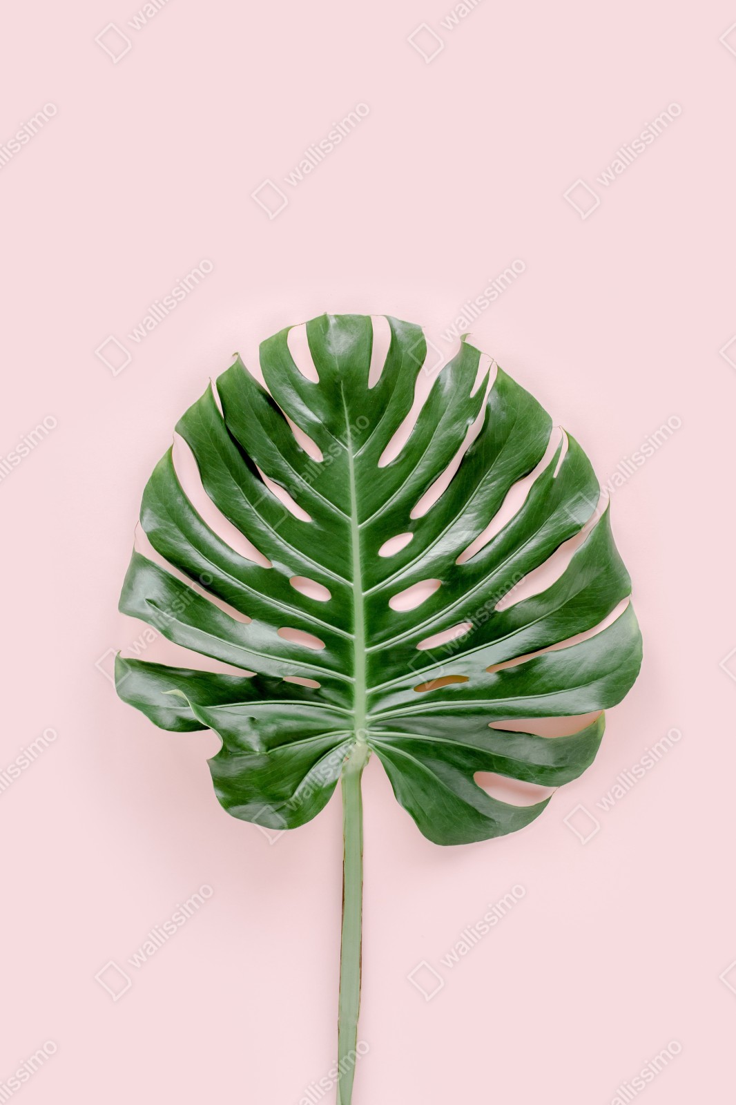 Verleihen Sie Ihrem Raum Ruhe mit einem Monstera-Blatt vor sanftem rosa Hintergrund, ideal für moderne und skandinavische Einrichtungen.