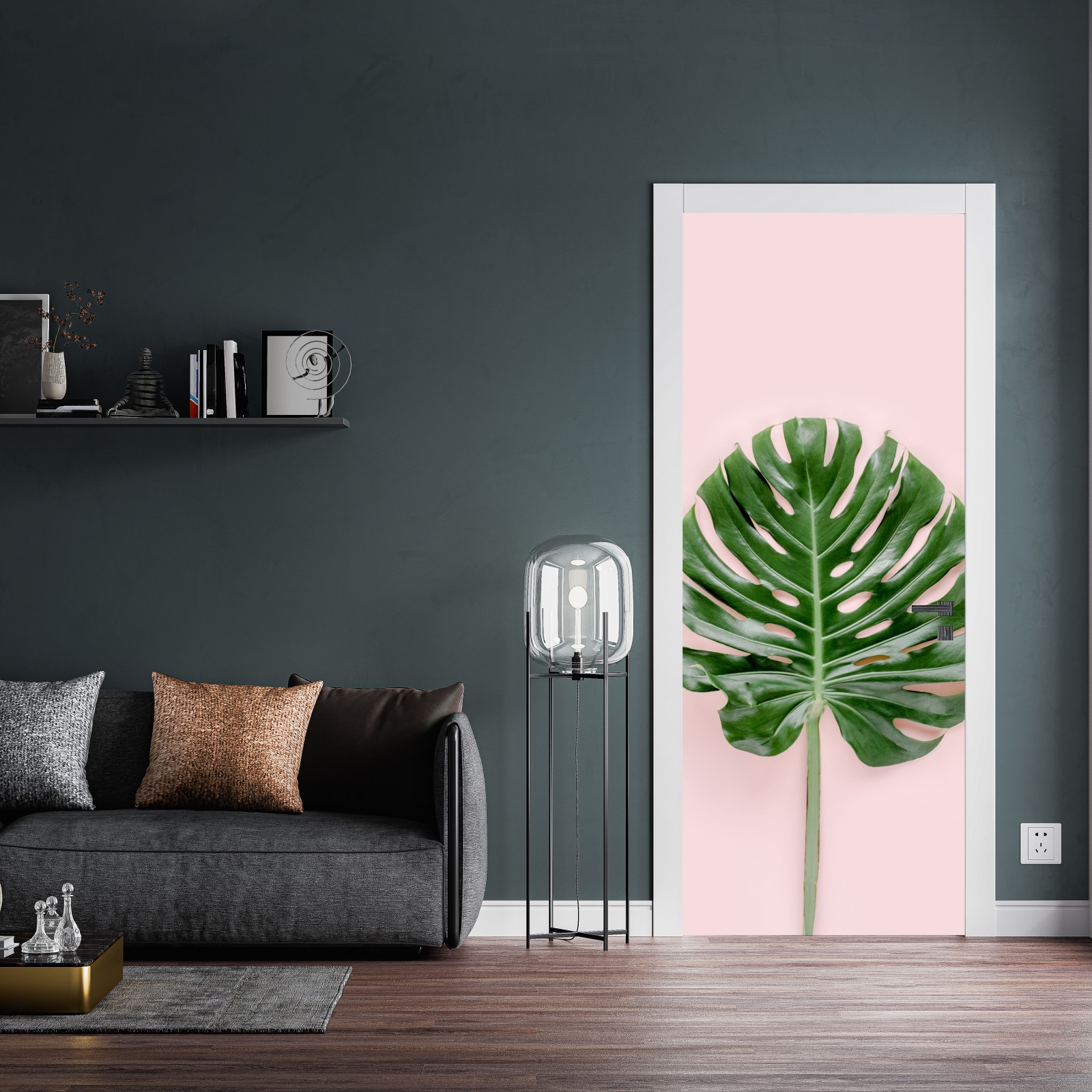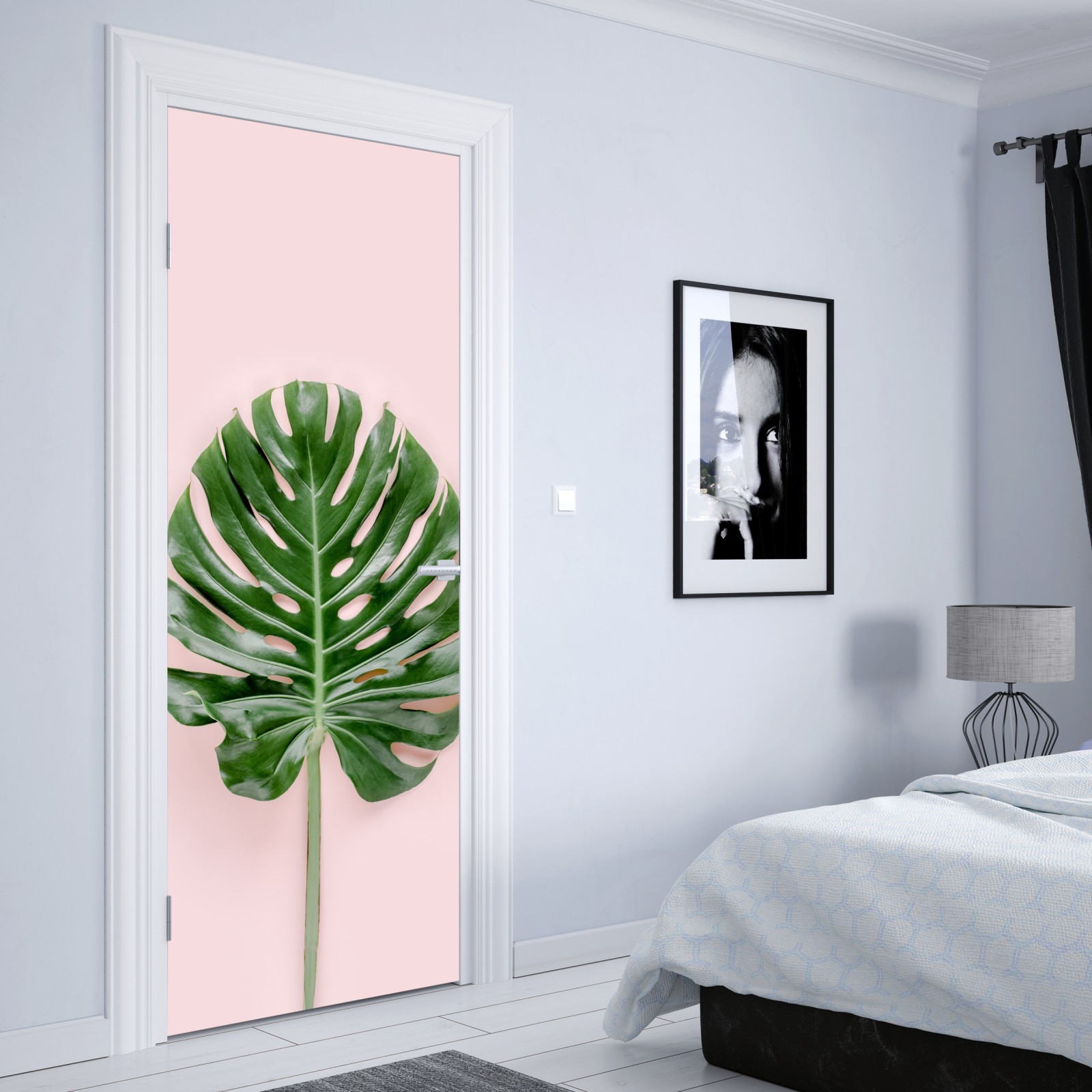 Türaufkleber monstera-blatt auf pastell-rosa hintergrund