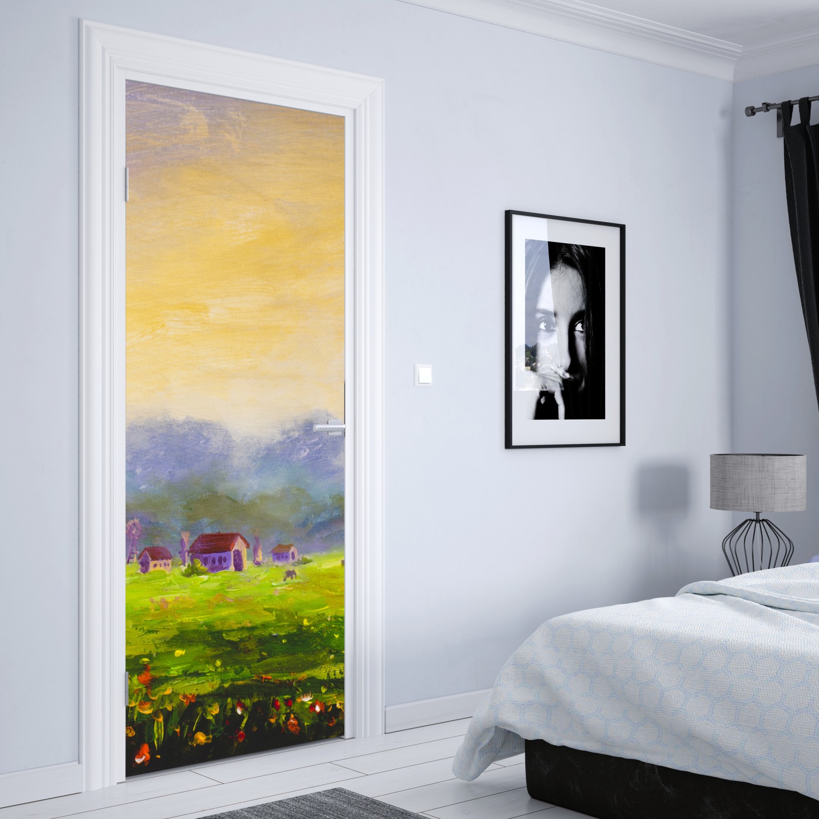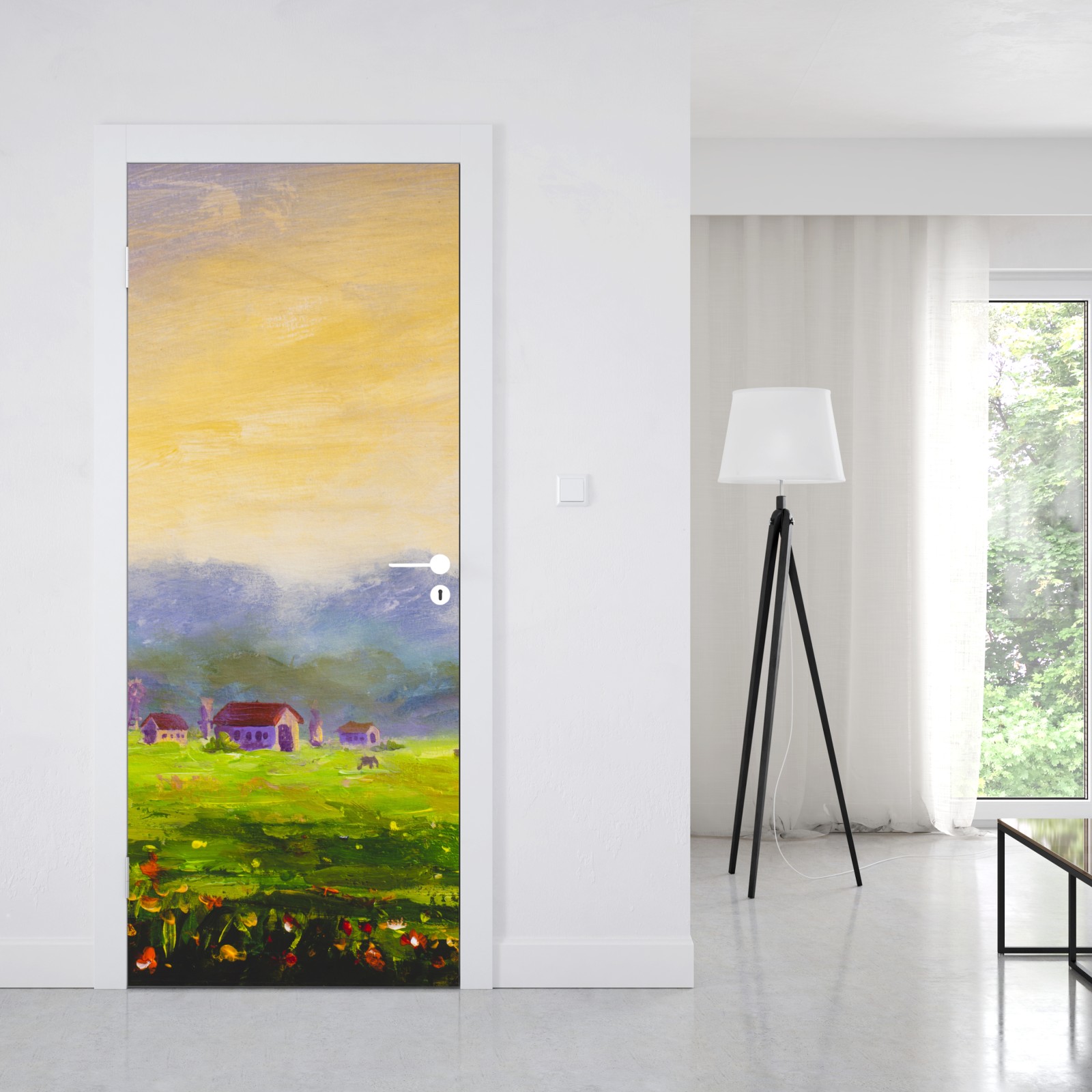 Erleben Sie die Ruhe eines ländlichen Sonnenaufgangs in diesem ölmalerei-inspirierten Landschaftsbild mit grasenden Kühen.