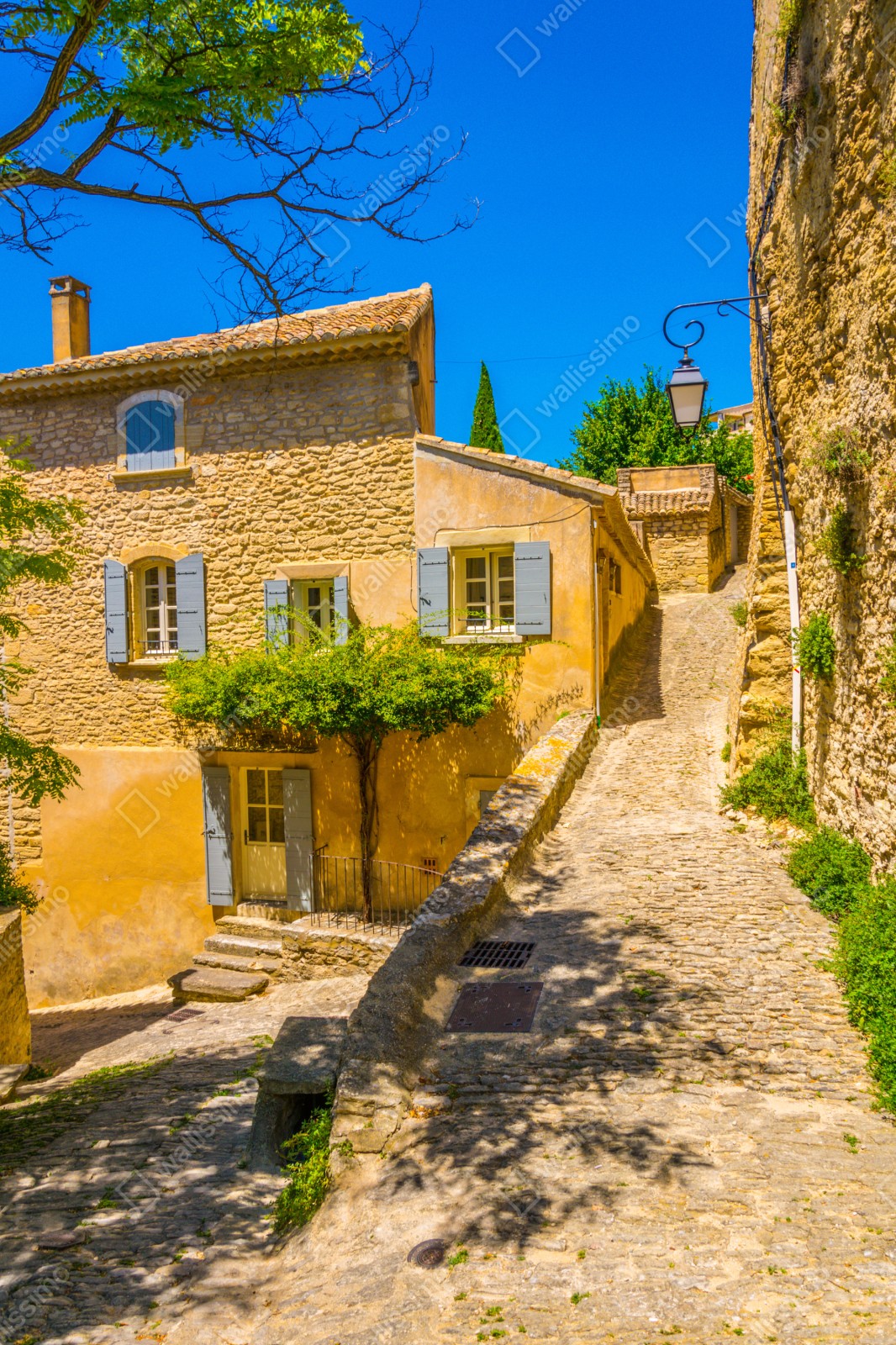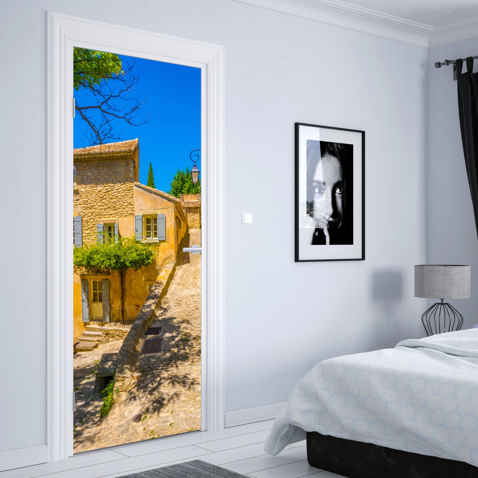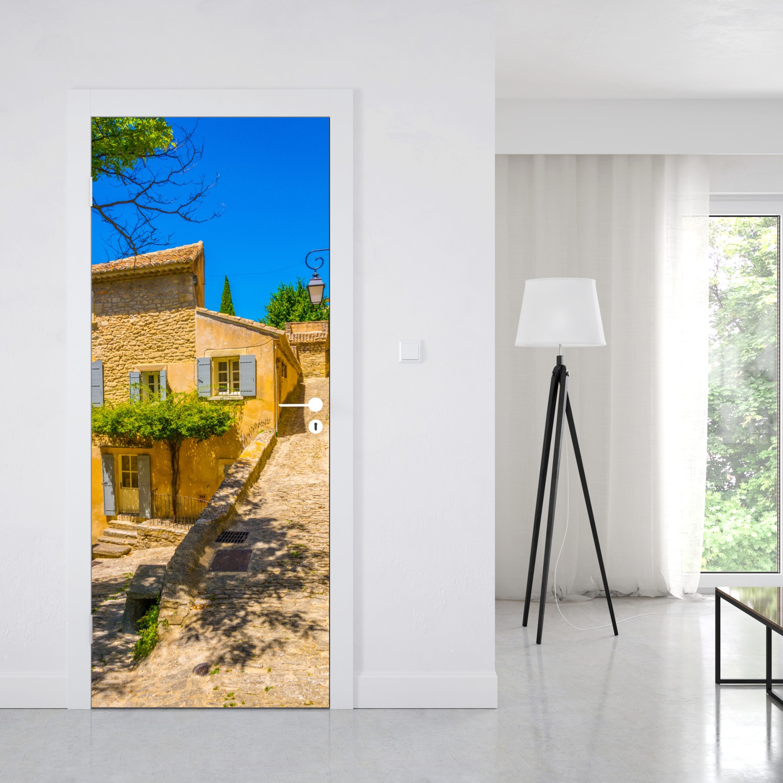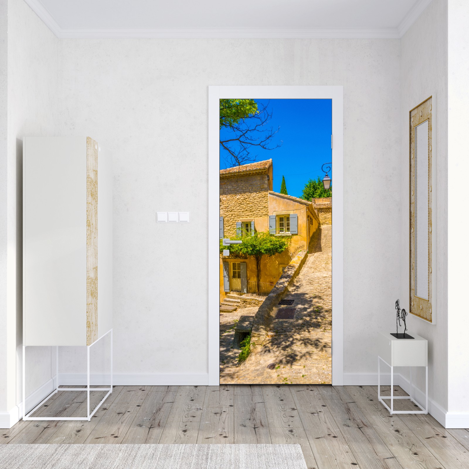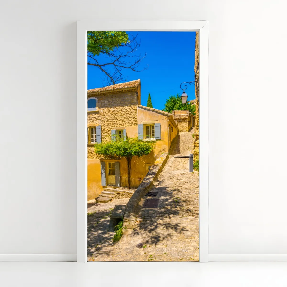 Bringen Sie mediterrane Wärme an Ihre Wand mit dieser sonnigen kopfsteinpflastergasse, ideal für ein gemütliches, rustikales Ambiente.