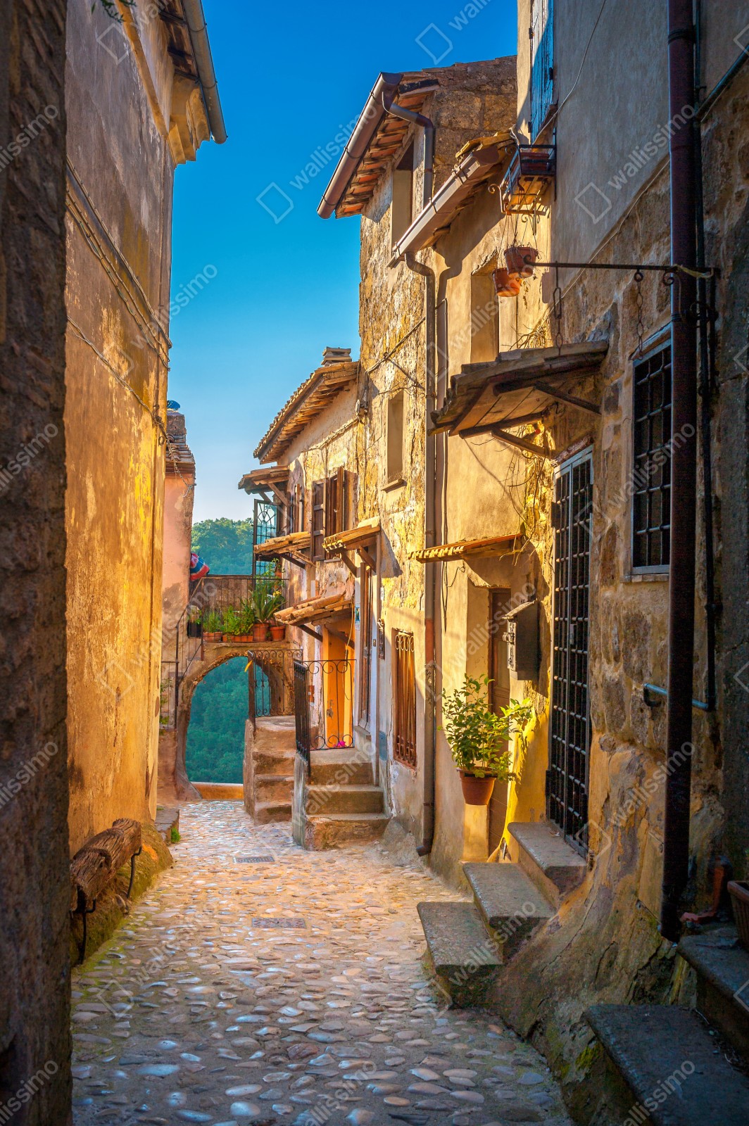 Erleben Sie den warmen Charme einer mittelalterlichen Gasse in der Toskana bei Sonnenuntergang.