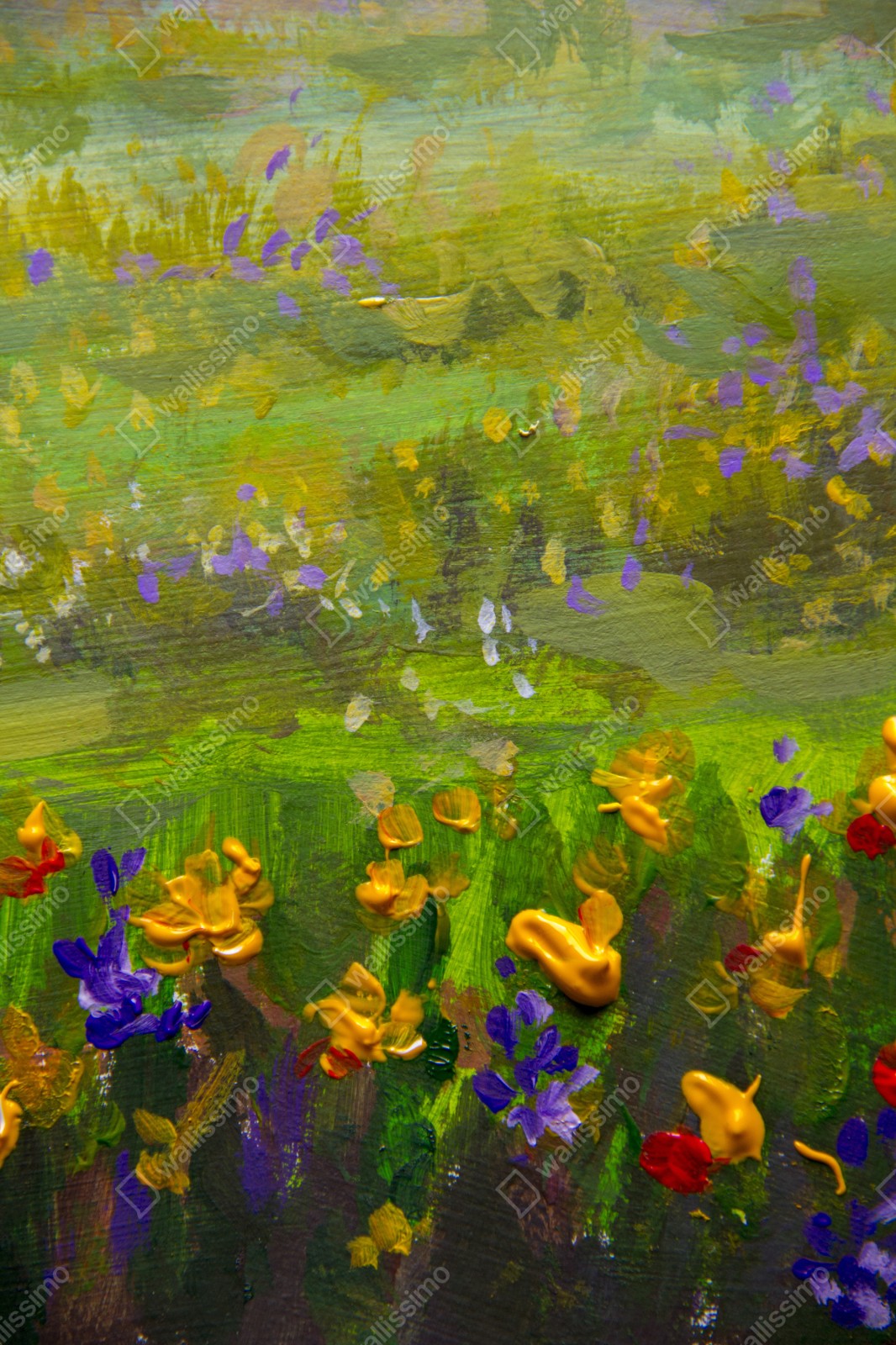 Bringen Sie lebendige florale Energie in Ihren Raum mit diesem Ölbild einer Wiese in violetten und gelben Tönen.