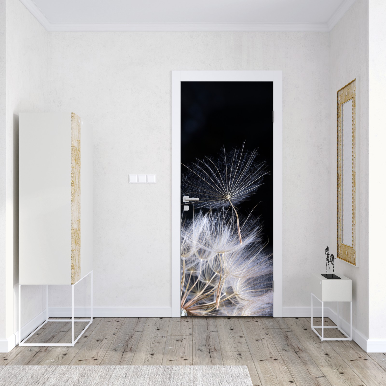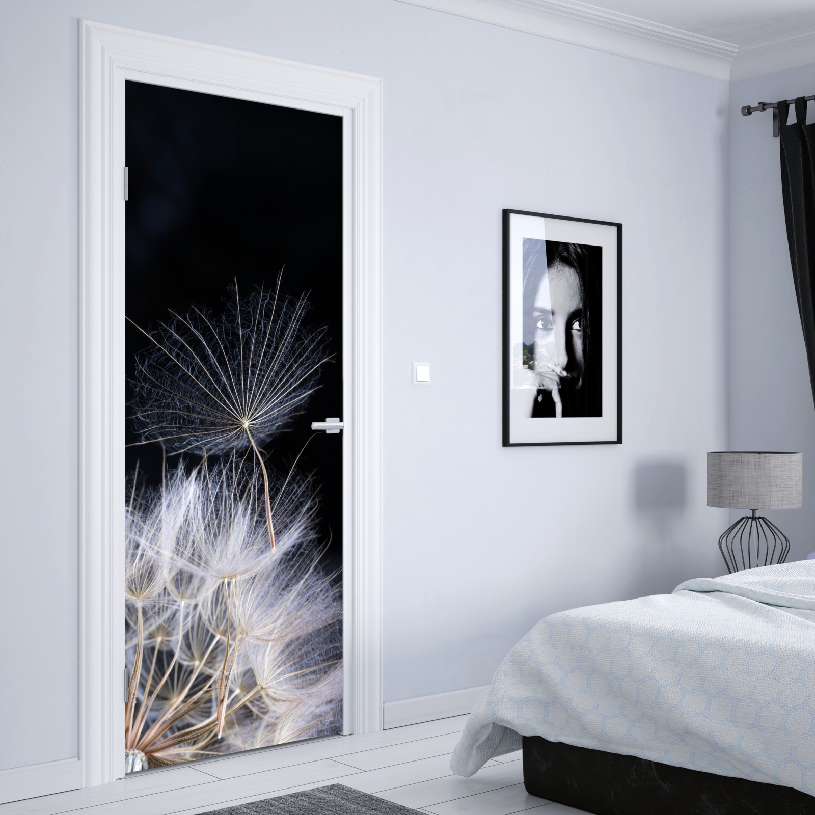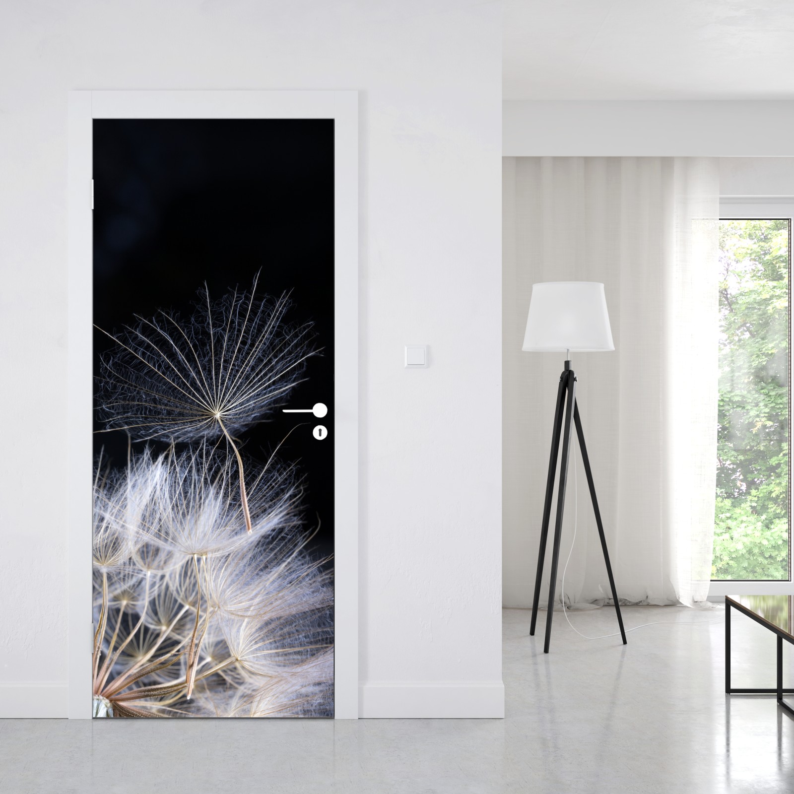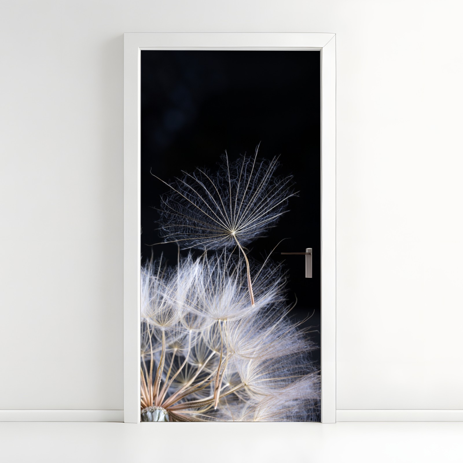 Türaufkleber zarter löwenzahnsamen auf schwarzem hintergrund