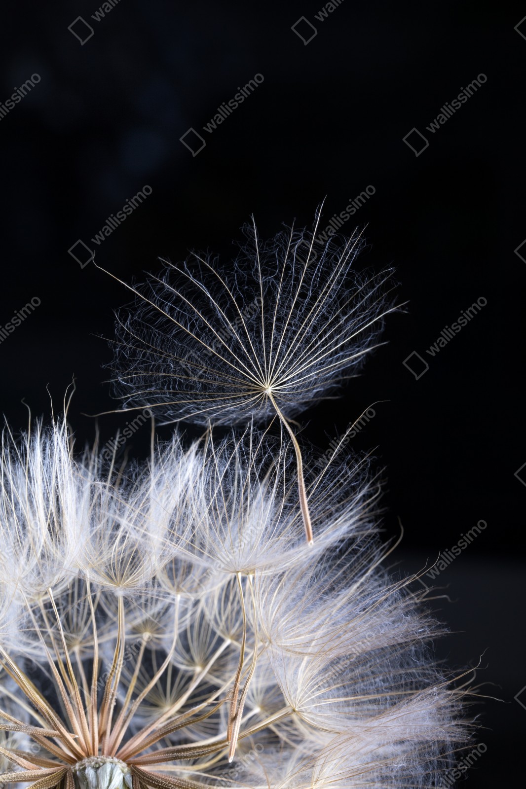 Zarter Löwenzahnsamen in beeindruckender Detailaufnahme vor tiefschwarzem Hintergrund, perfekt für minimalistische Räume.