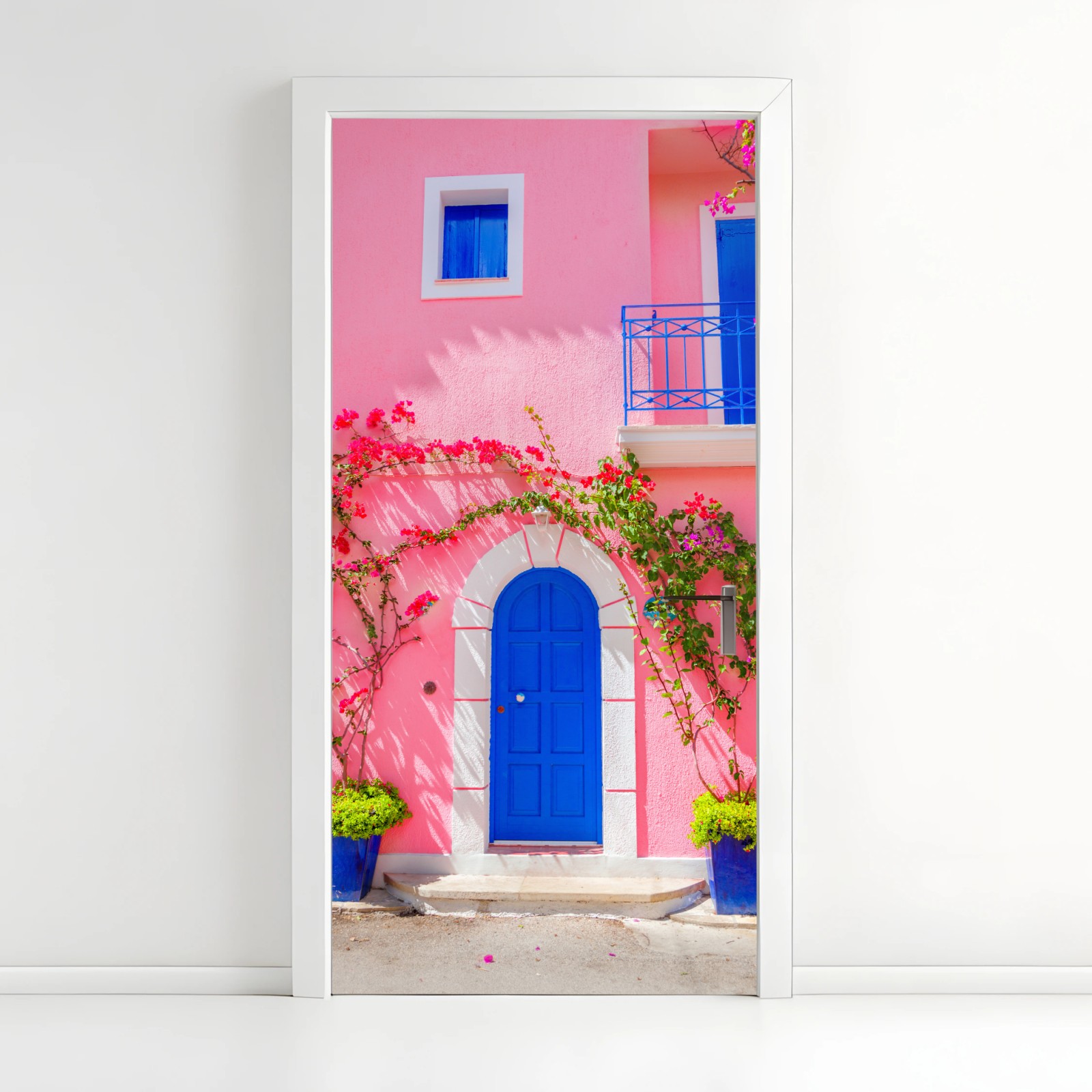 Türaufkleber Leuchtende rosa fassade mit blauer tür