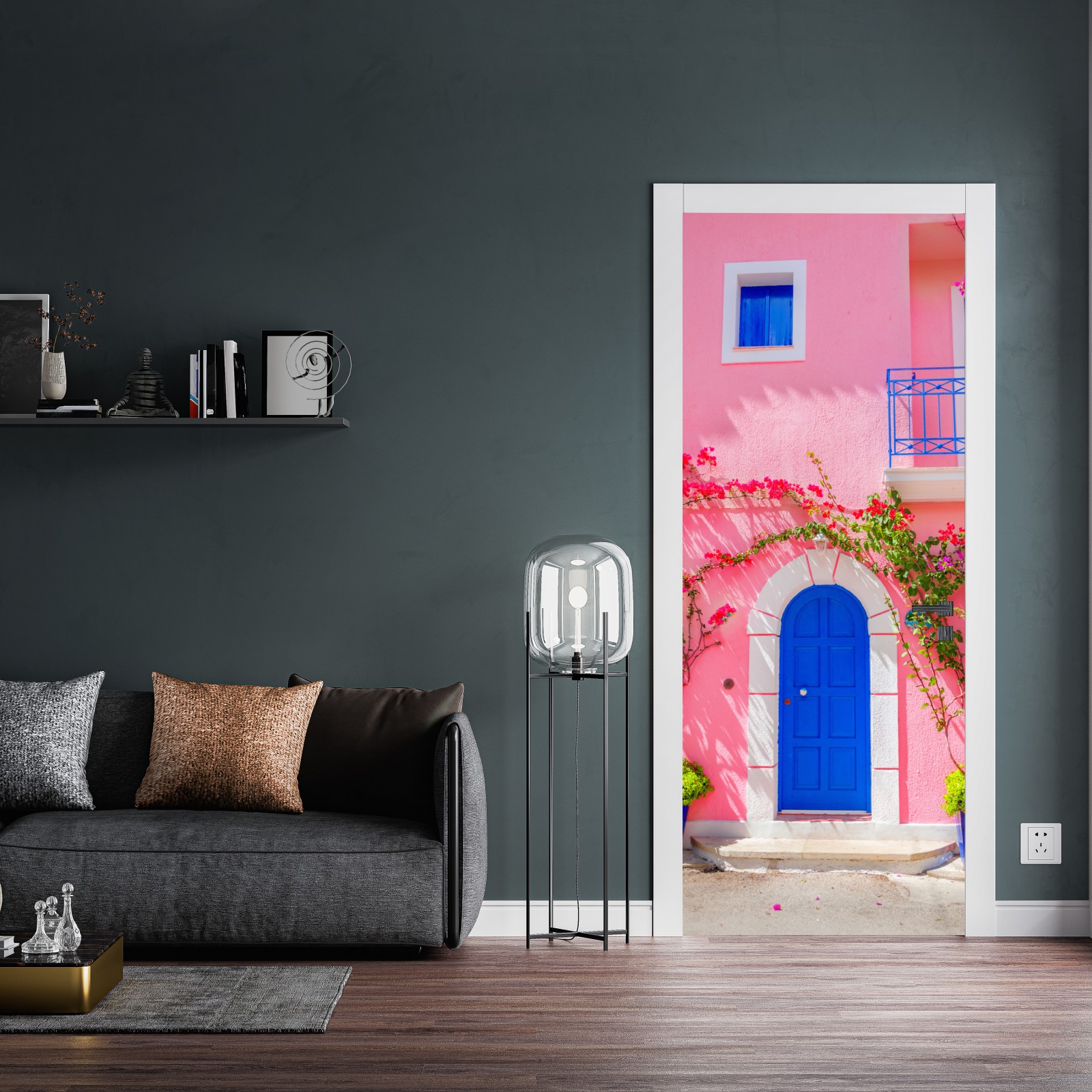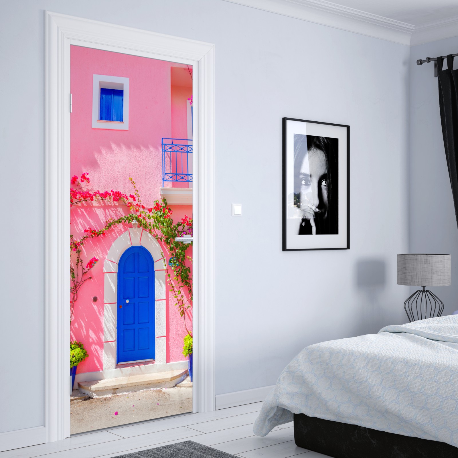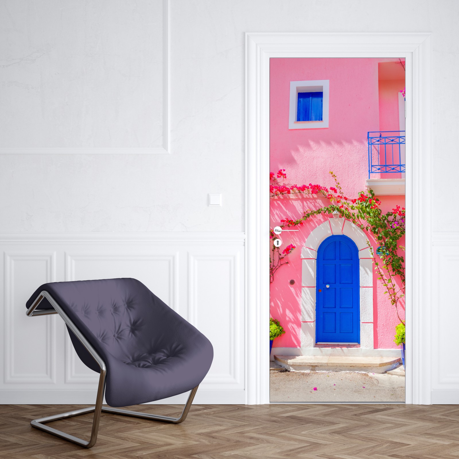 Türaufkleber leuchtende rosa fassade mit blauer tür
