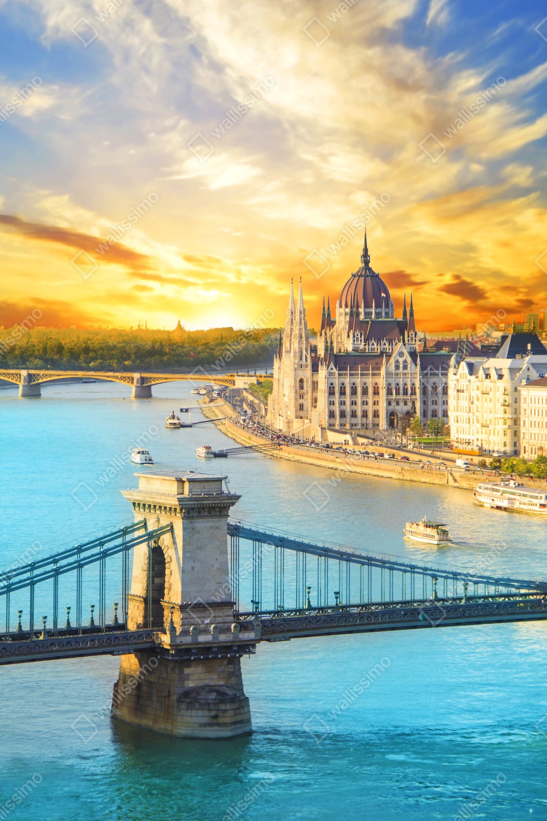 Erleben Sie den goldenen Abend über Budapest mit dieser lebendigen Stadtansicht, die die Kettenbrücke und die Uferarchitektur zeigt.