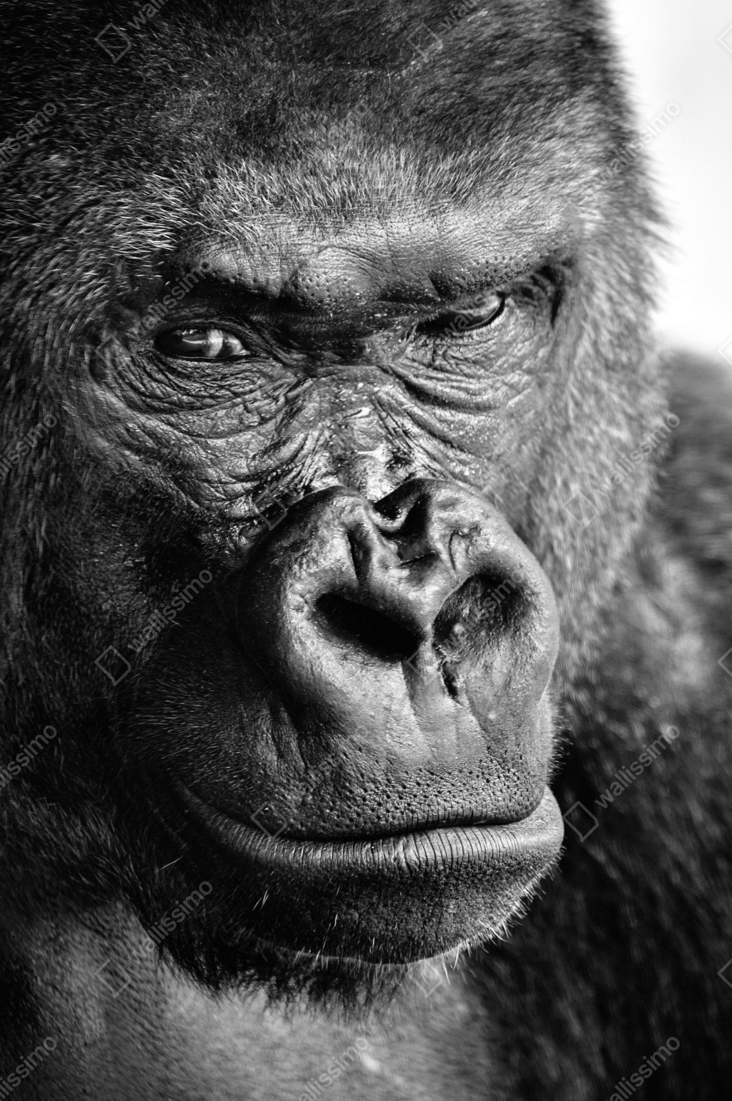 Dramatisches schwarzweiß-Porträt eines Gorillas, das jedem Raum Tiefe und natürliche Textur verleiht.