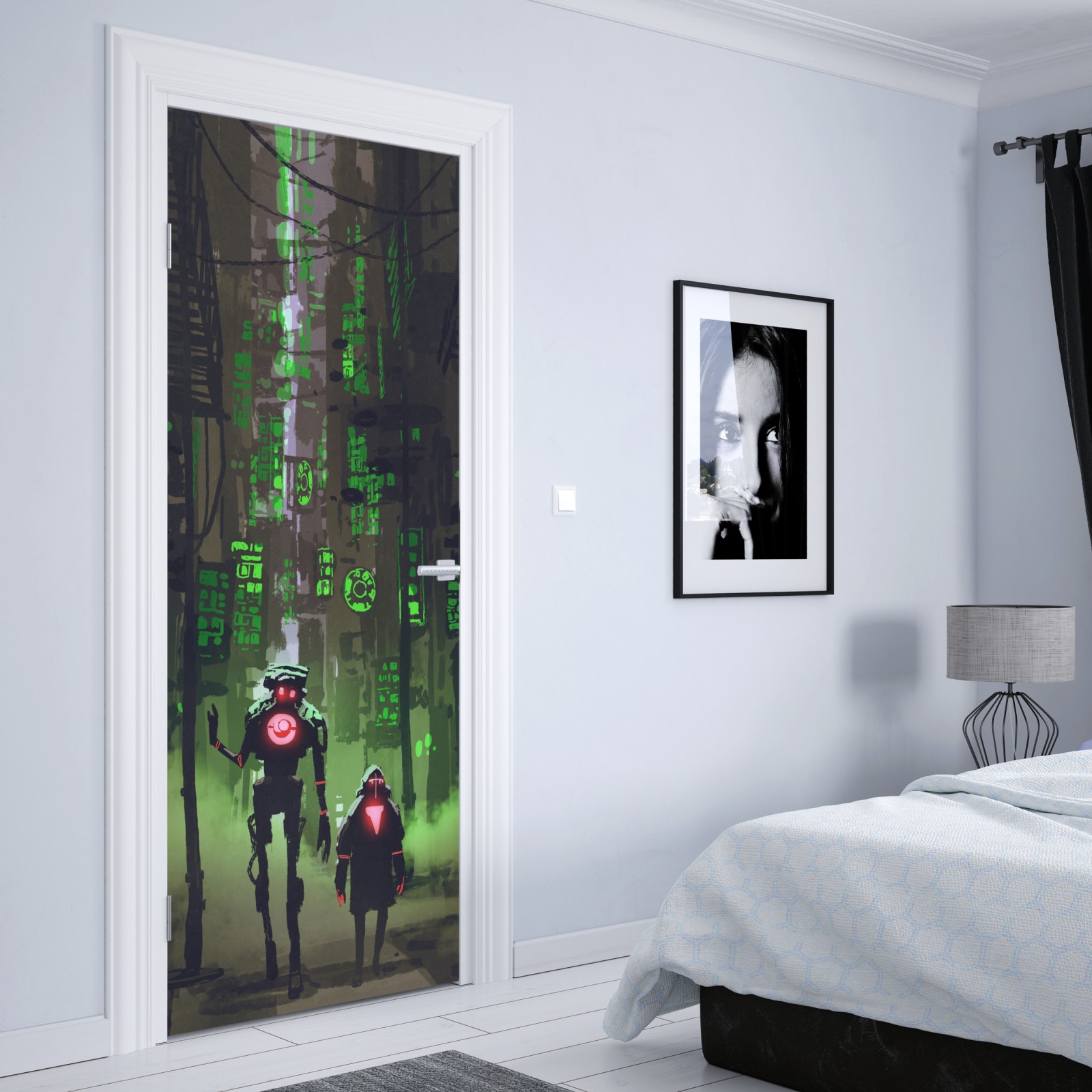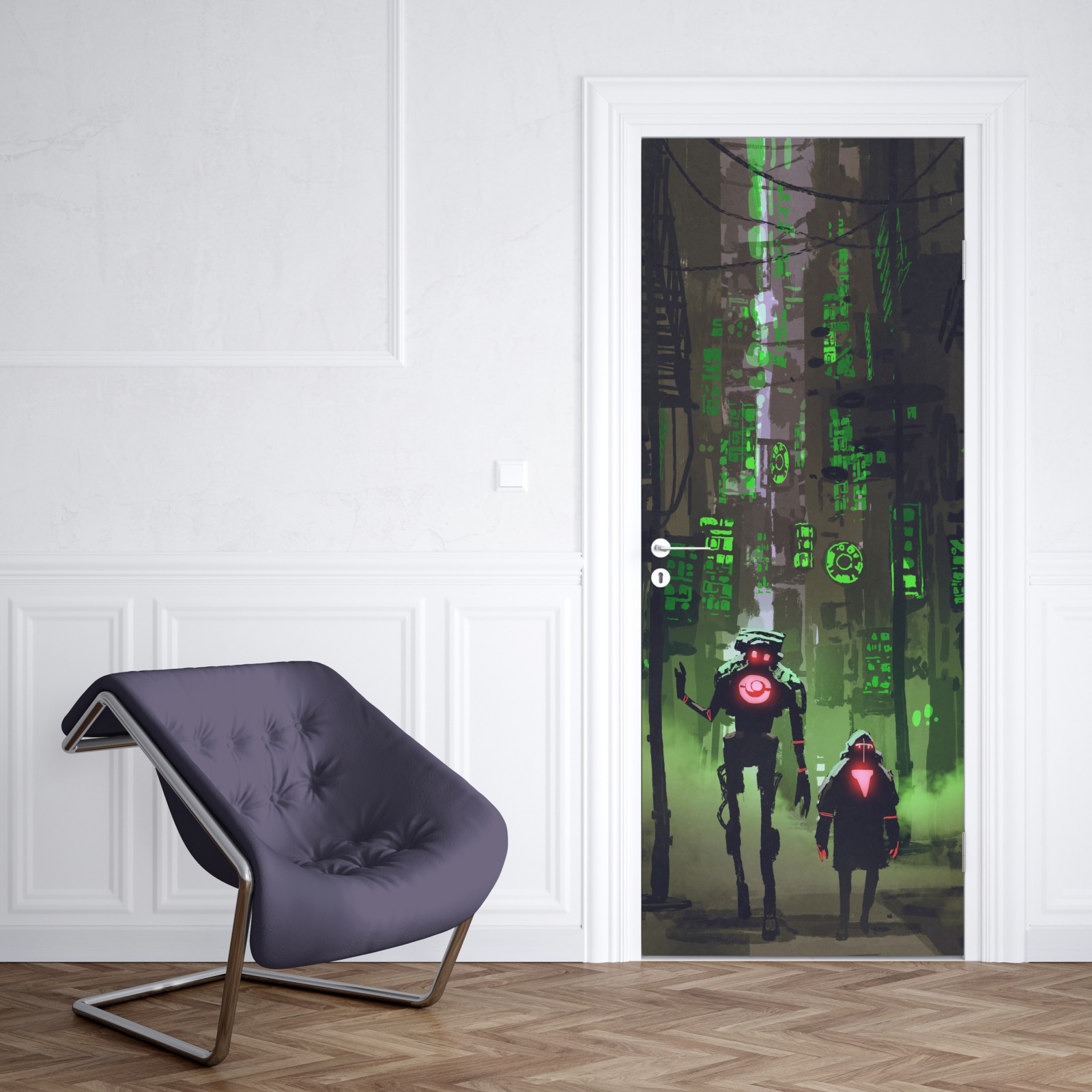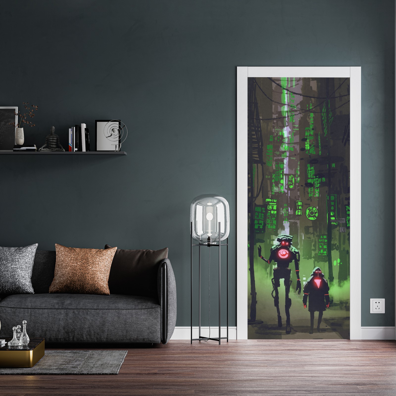 Erleben Sie eine futuristische Stadtszene mit robotischen Figuren im grünen Neonlicht, ideal für moderne Innenräume.