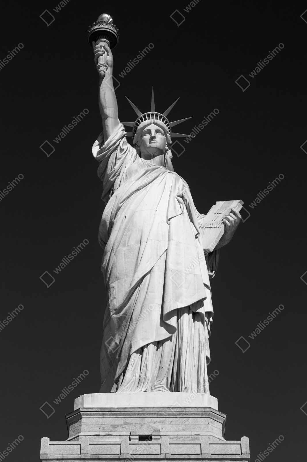 Schaffen Sie ein eindrucksvolles schwarzweiß-wandbild mit der Freiheitsstatue vor tiefschwarzem Himmel für starken Kontrast.