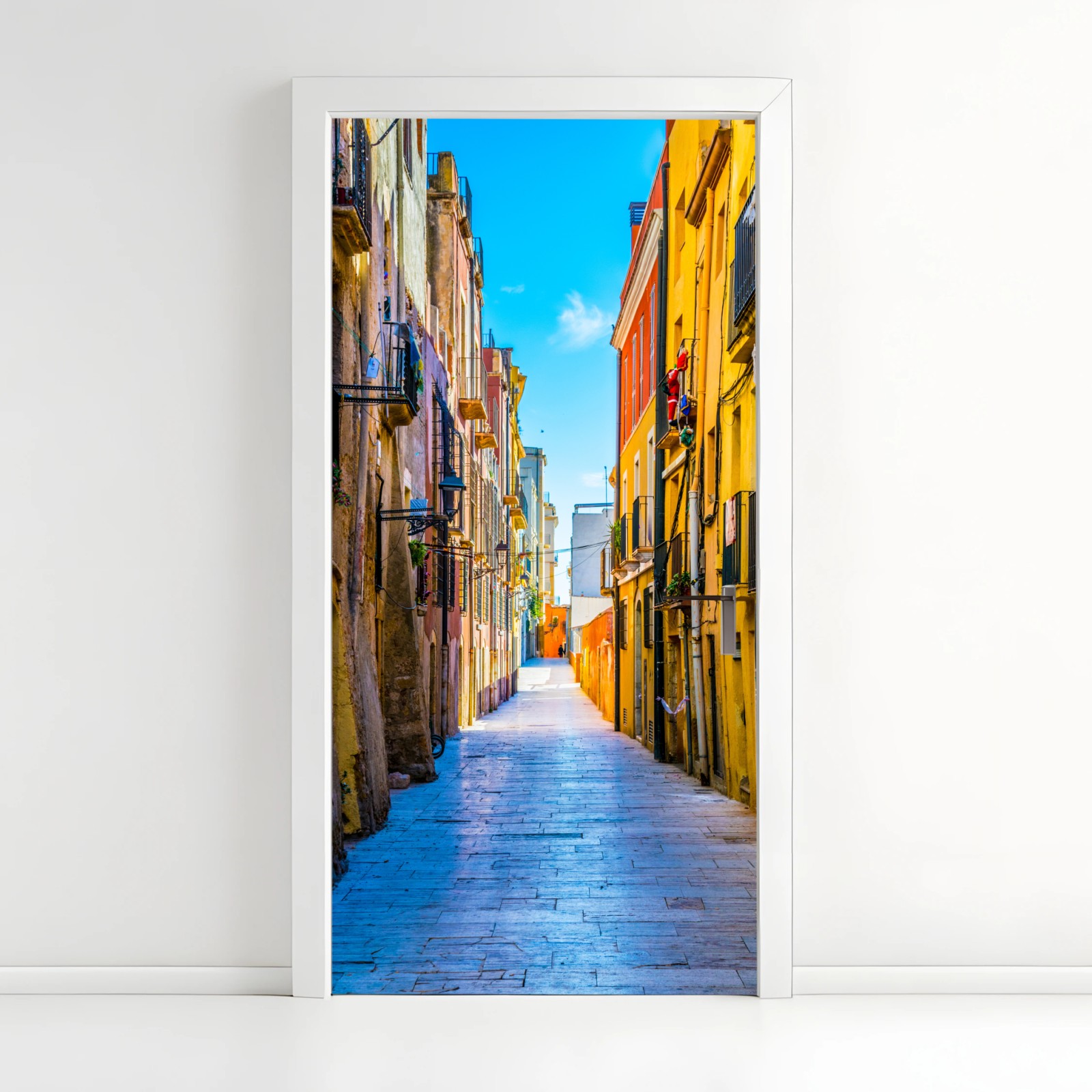 Türaufkleber Sonnenbeschienene mediterrane gasse mit bunten fassaden