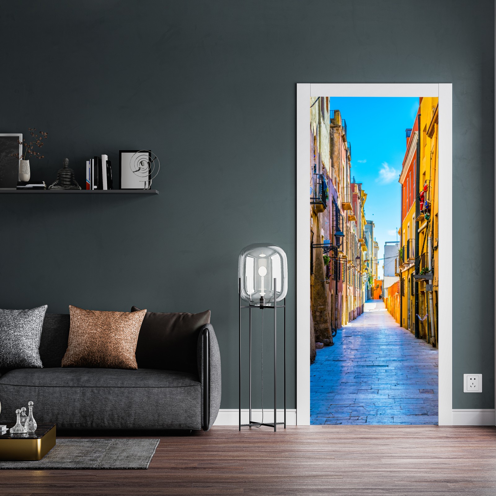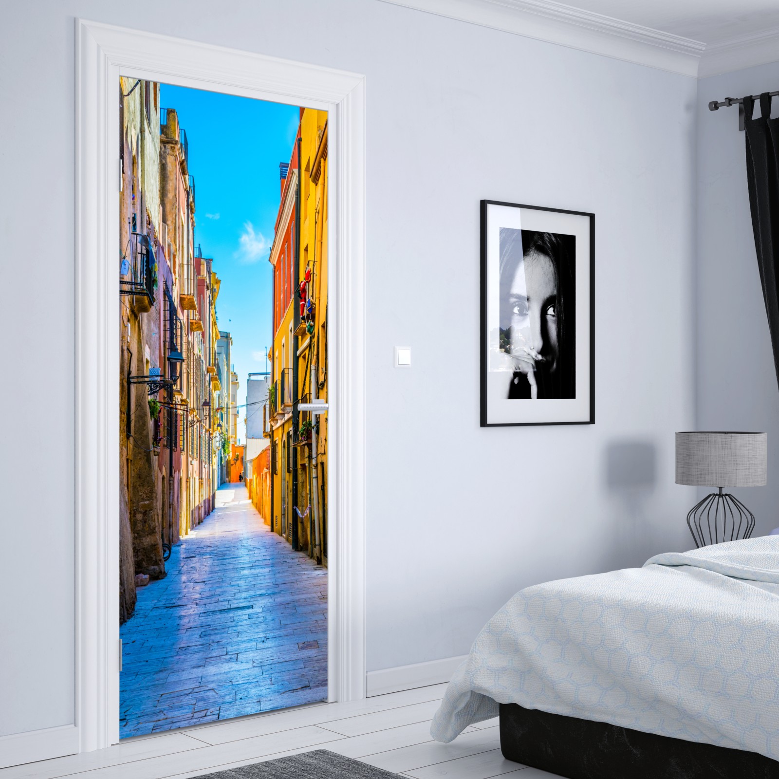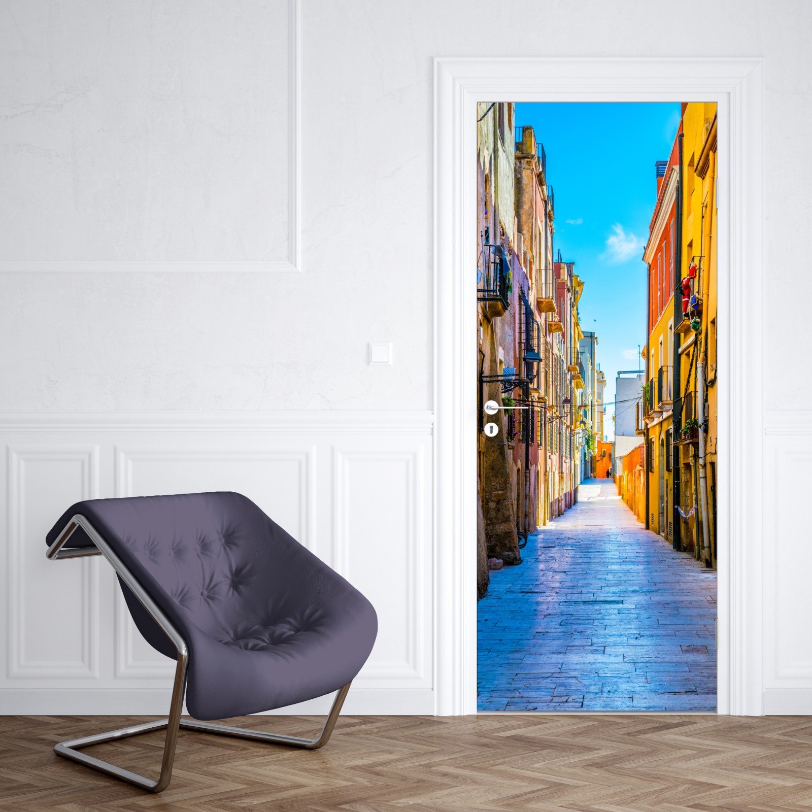 Türaufkleber sonnenbeschienene mediterrane gasse mit bunten fassaden