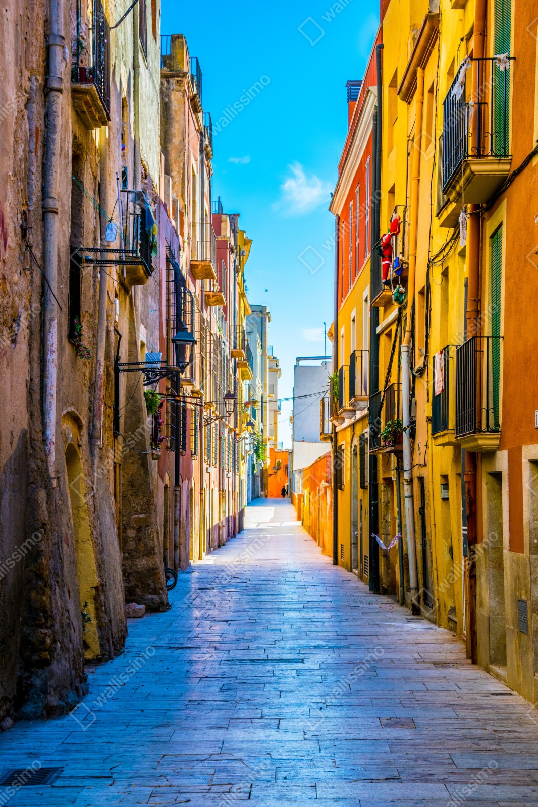 Bringen Sie mediterrane Lebendigkeit in Ihr Zuhause mit dieser sonnenbeschienenen Gasse und ihren bunten Fassaden.