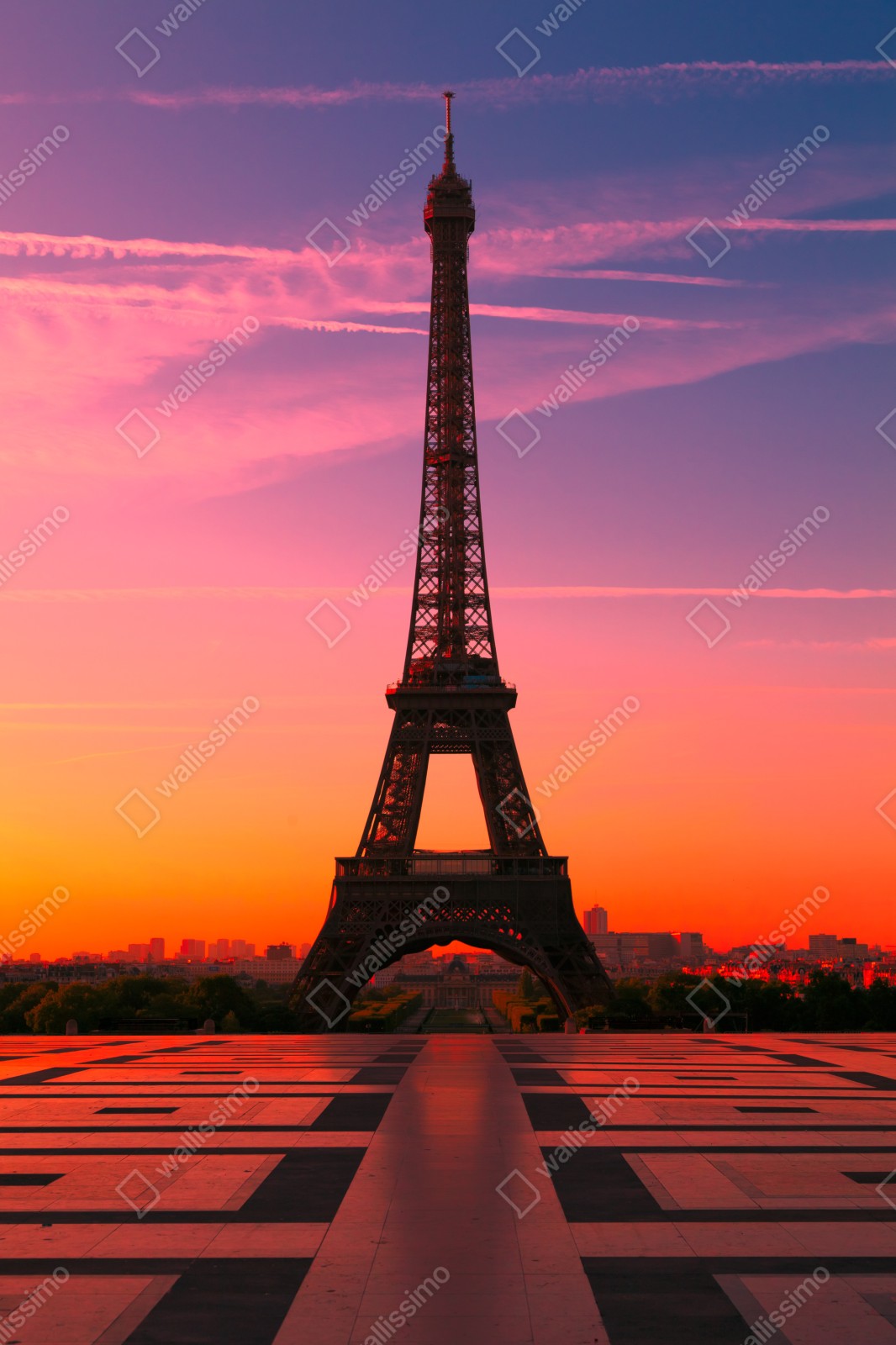 Erleben Sie das romantische Leuchten von Paris im Morgengrauen mit diesem intensiven Blick auf den Eiffelturm vor rosa-orangefarbenem Himmel.