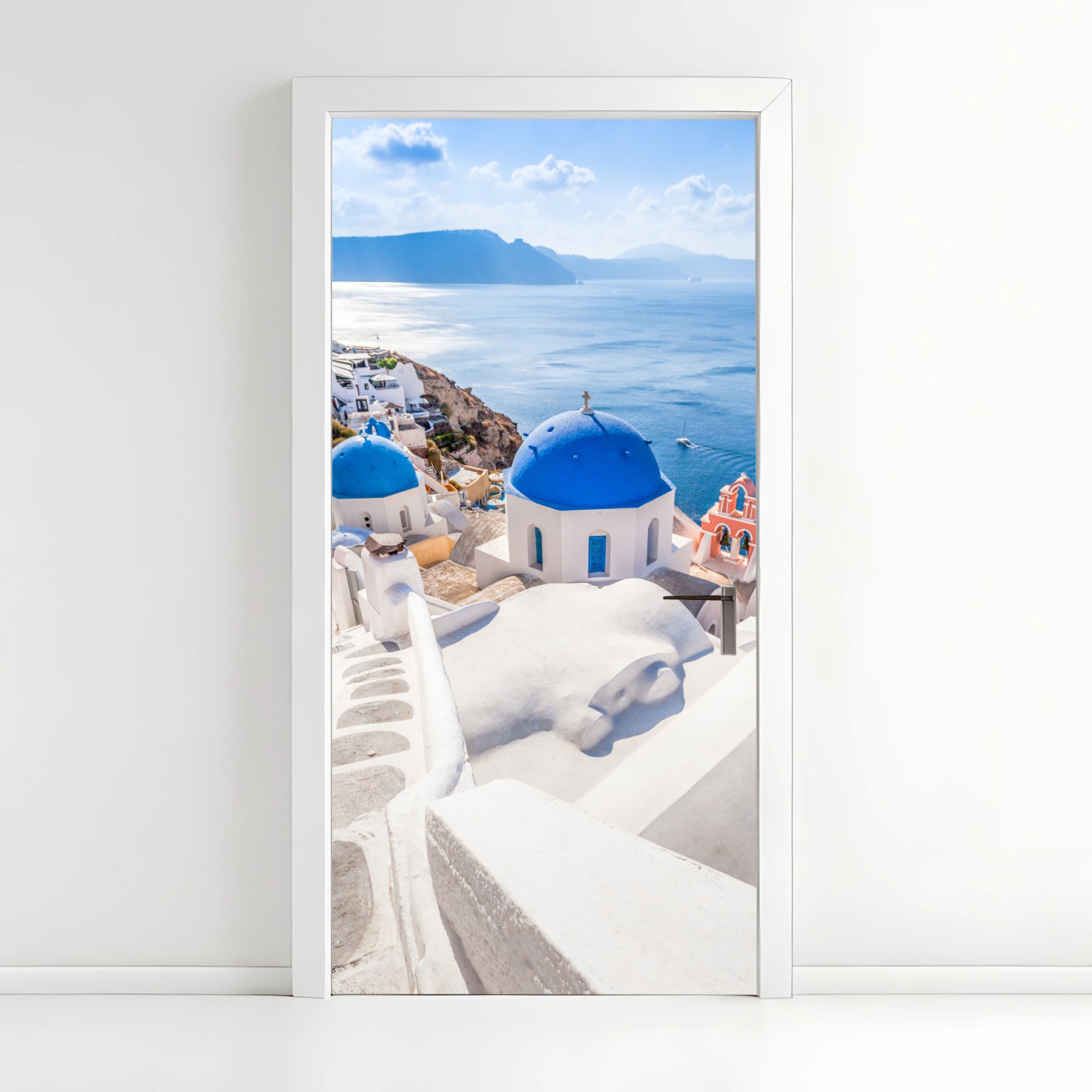 Türaufkleber Sonniges Santorini blaue kuppeln und meerblick
