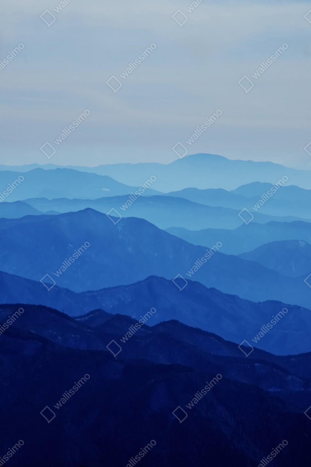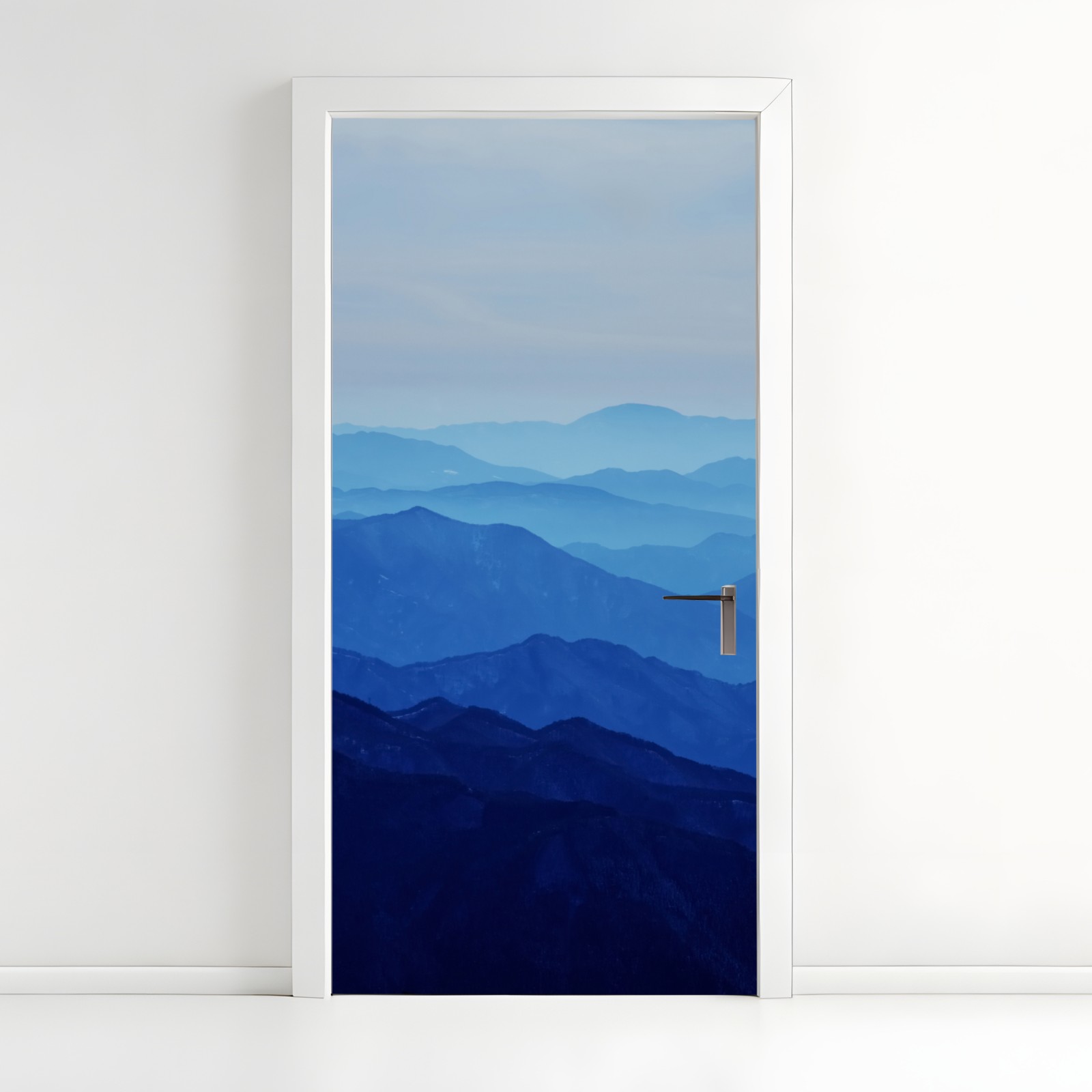 Bringen Sie Ruhe in Ihren Raum mit dieser nebligen blauen Berglandschaft mit geschichteten Gipfeln und sanfter Atmosphäre.